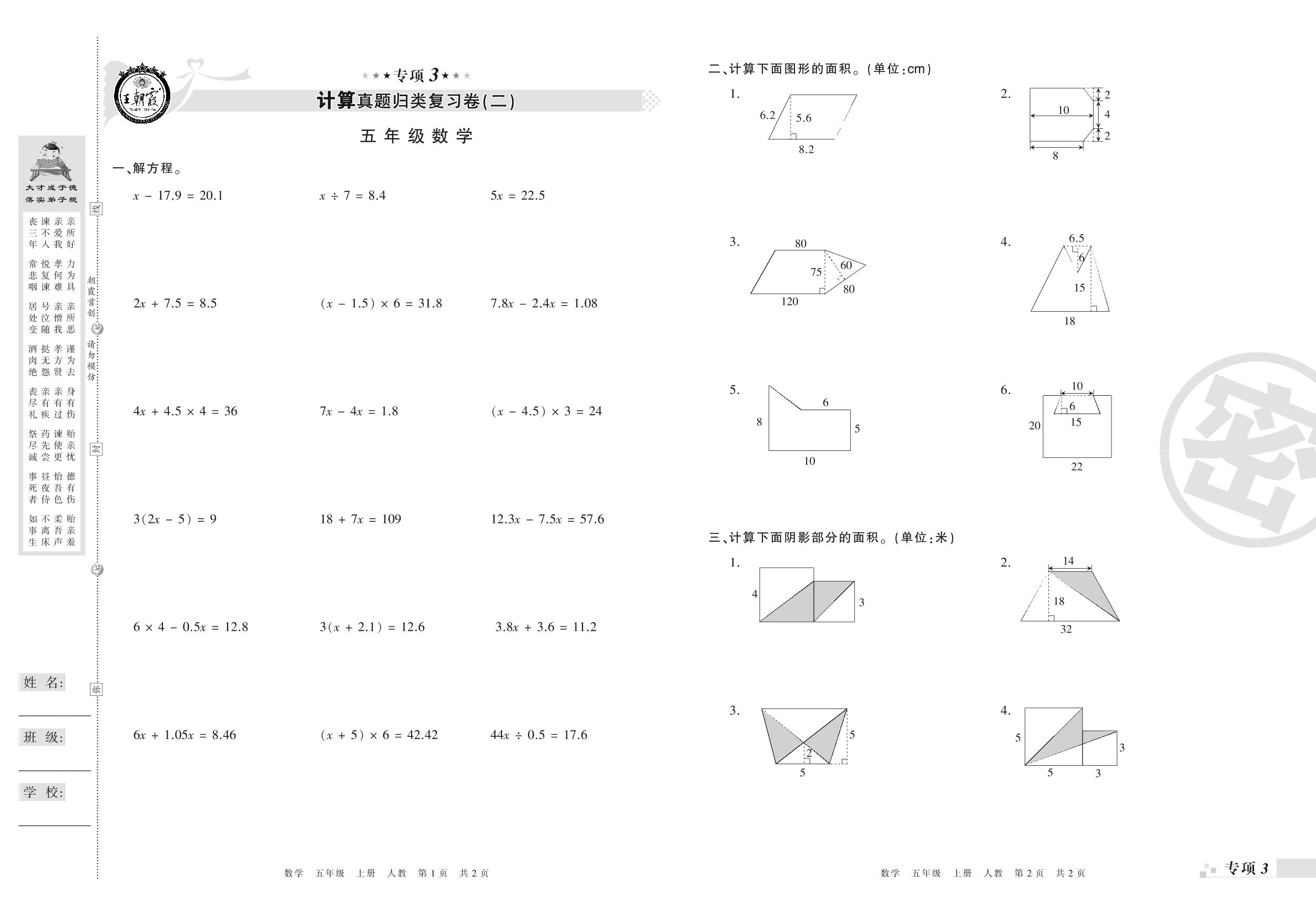 王朝霞期末专项卷——计算、解决问题真题归类复习五年级上册数学(人教版)_R210804173143【0】