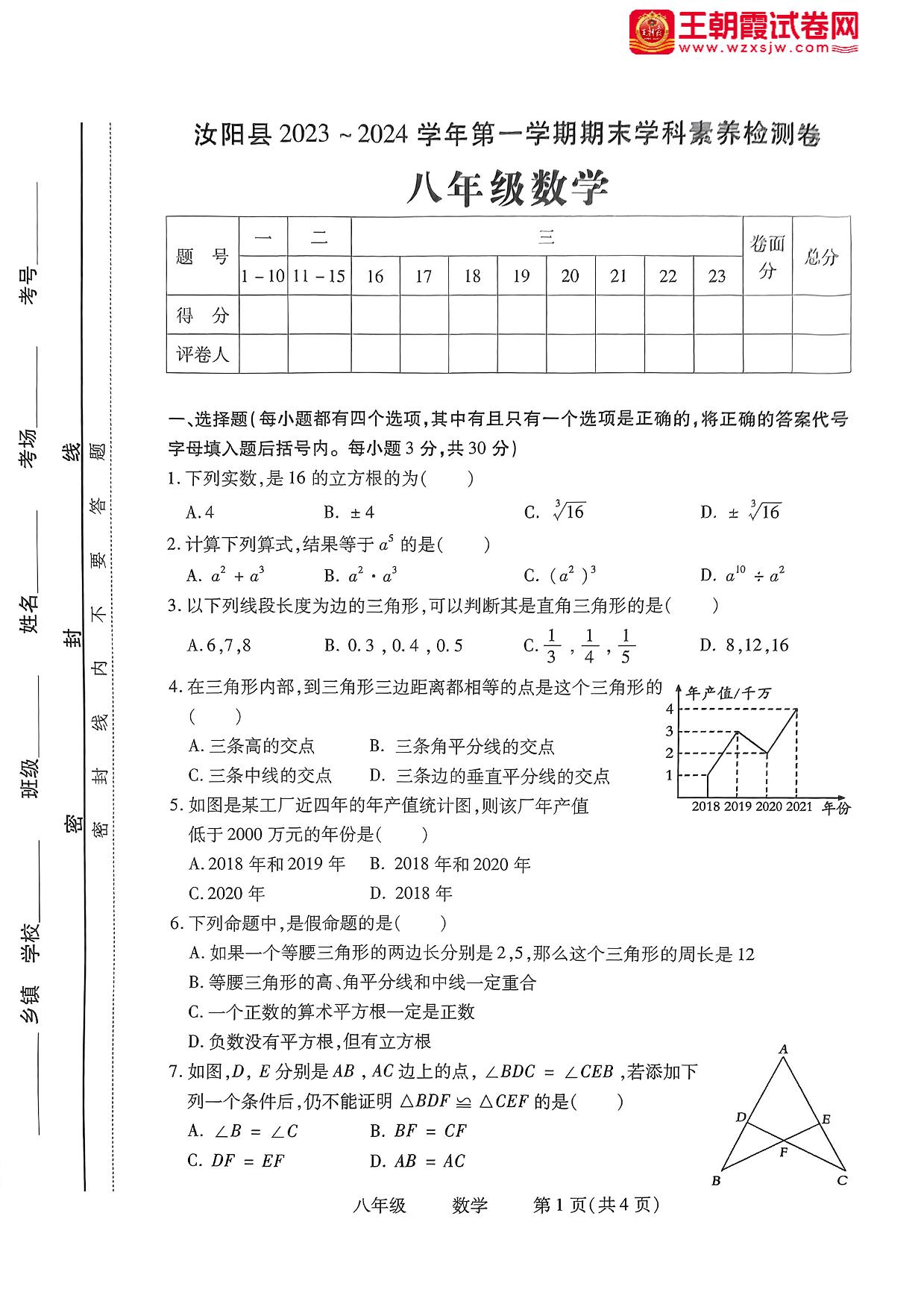 河南省洛阳市汝阳县2023-2024学年第一学期期末学科素养检测卷八年级数学(华师版)