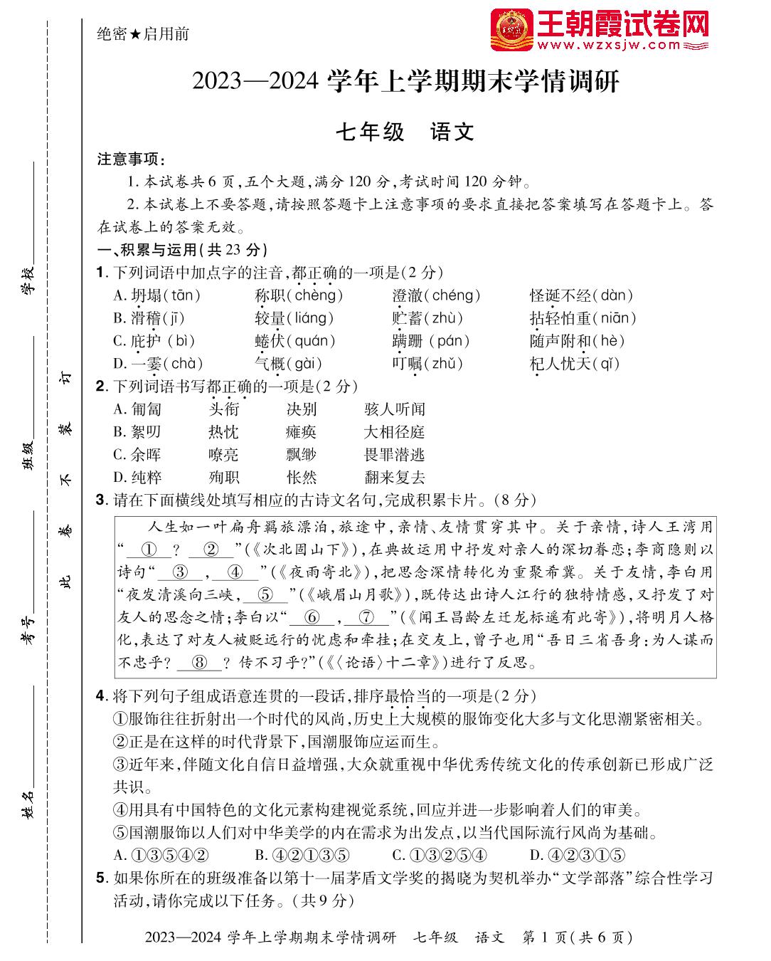 河南省洛阳市嵩县2023-2024学年上学期期末学情调研七年级语文(人教版)