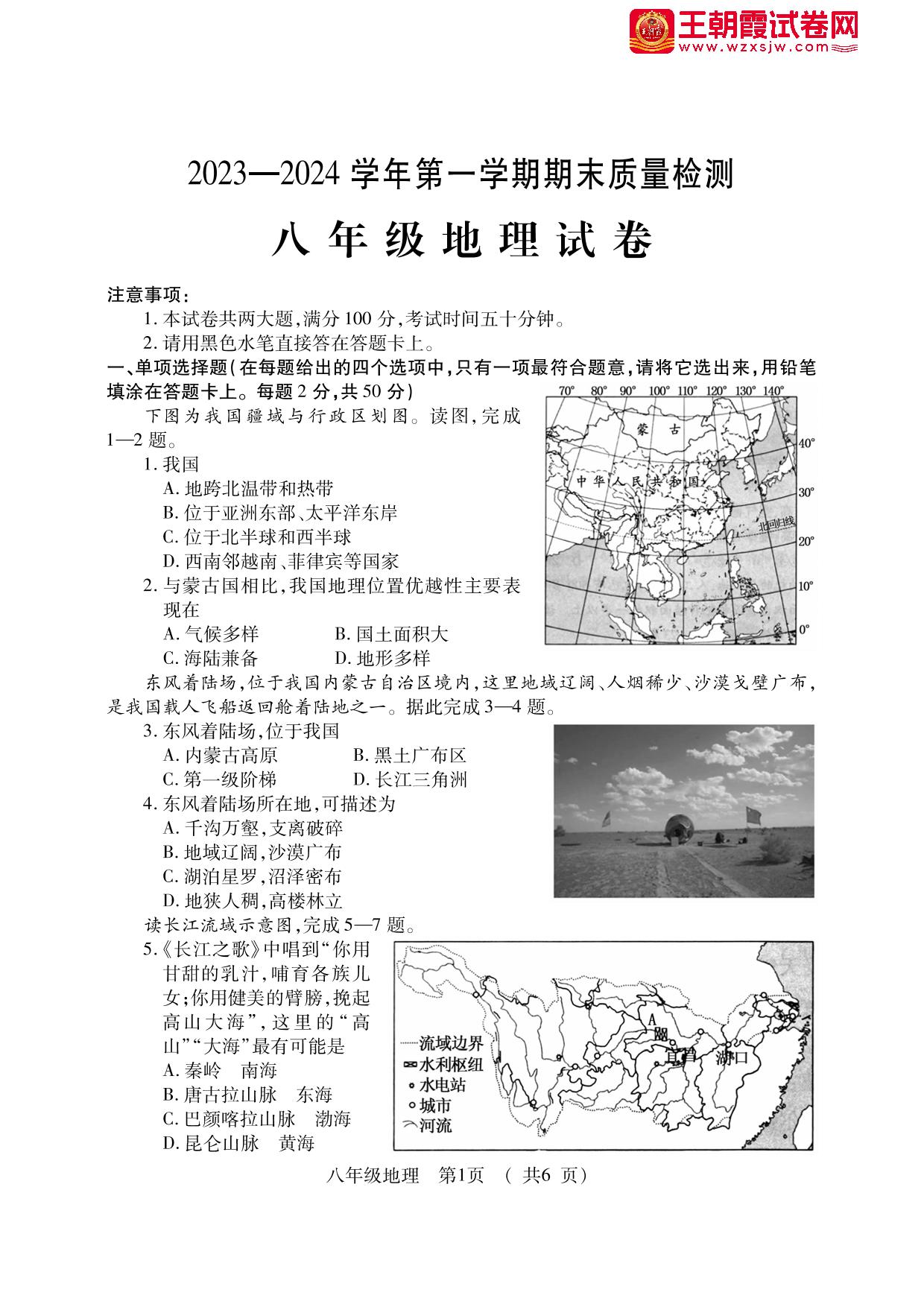 河南省洛阳市嵩县2023-2024学年第一学期期末考试试卷八年级地理(人教版)