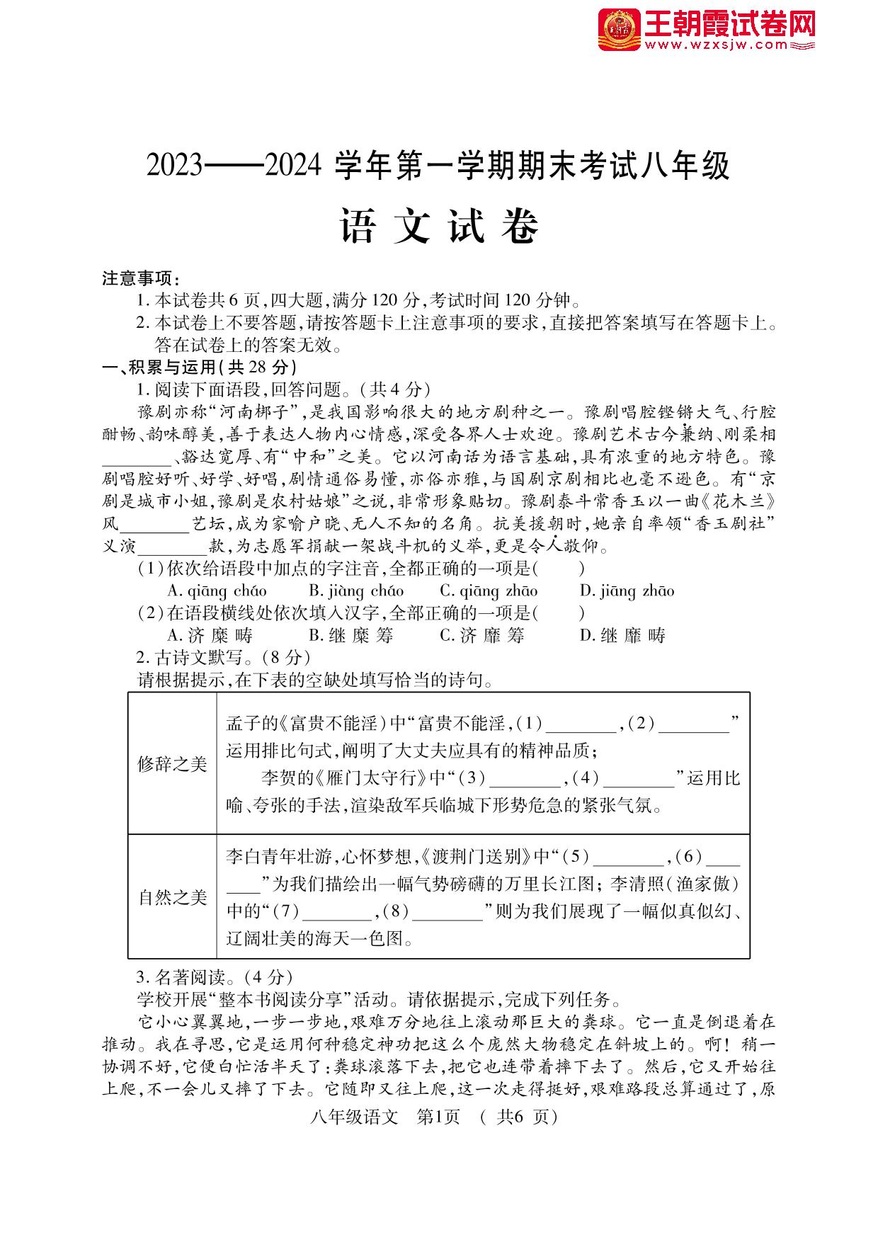 河南省洛阳市嵩县2023-2024学年第一学期期末考试试卷八年级语文(人教版)