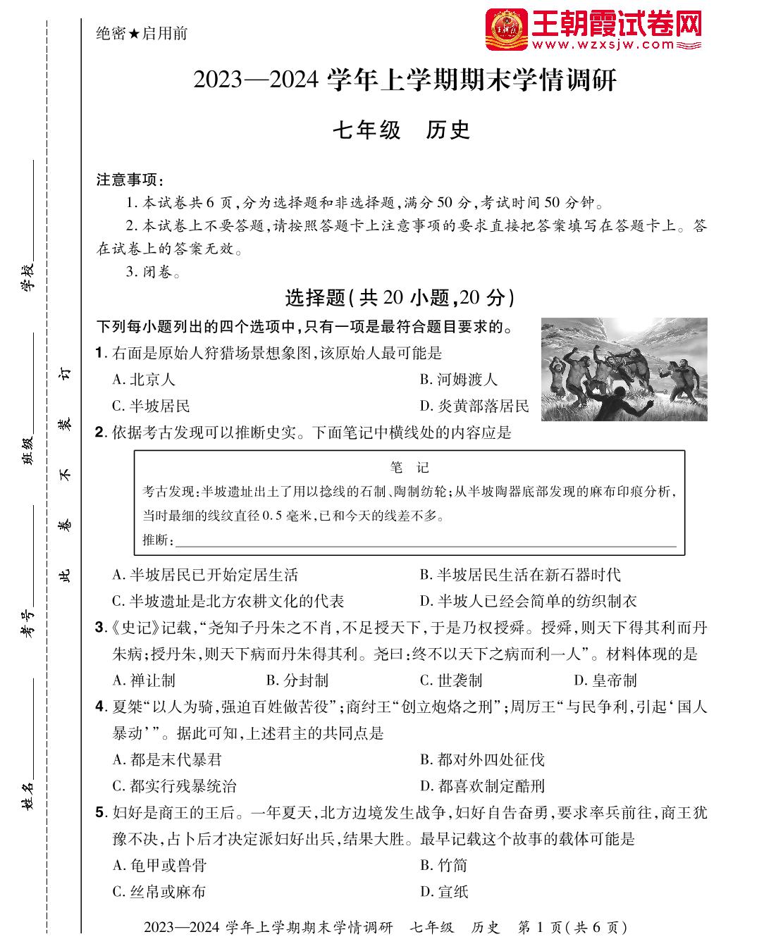 河南省洛阳市嵩县2023-2024学年上学期期末学情调研七年级历史(人教版)