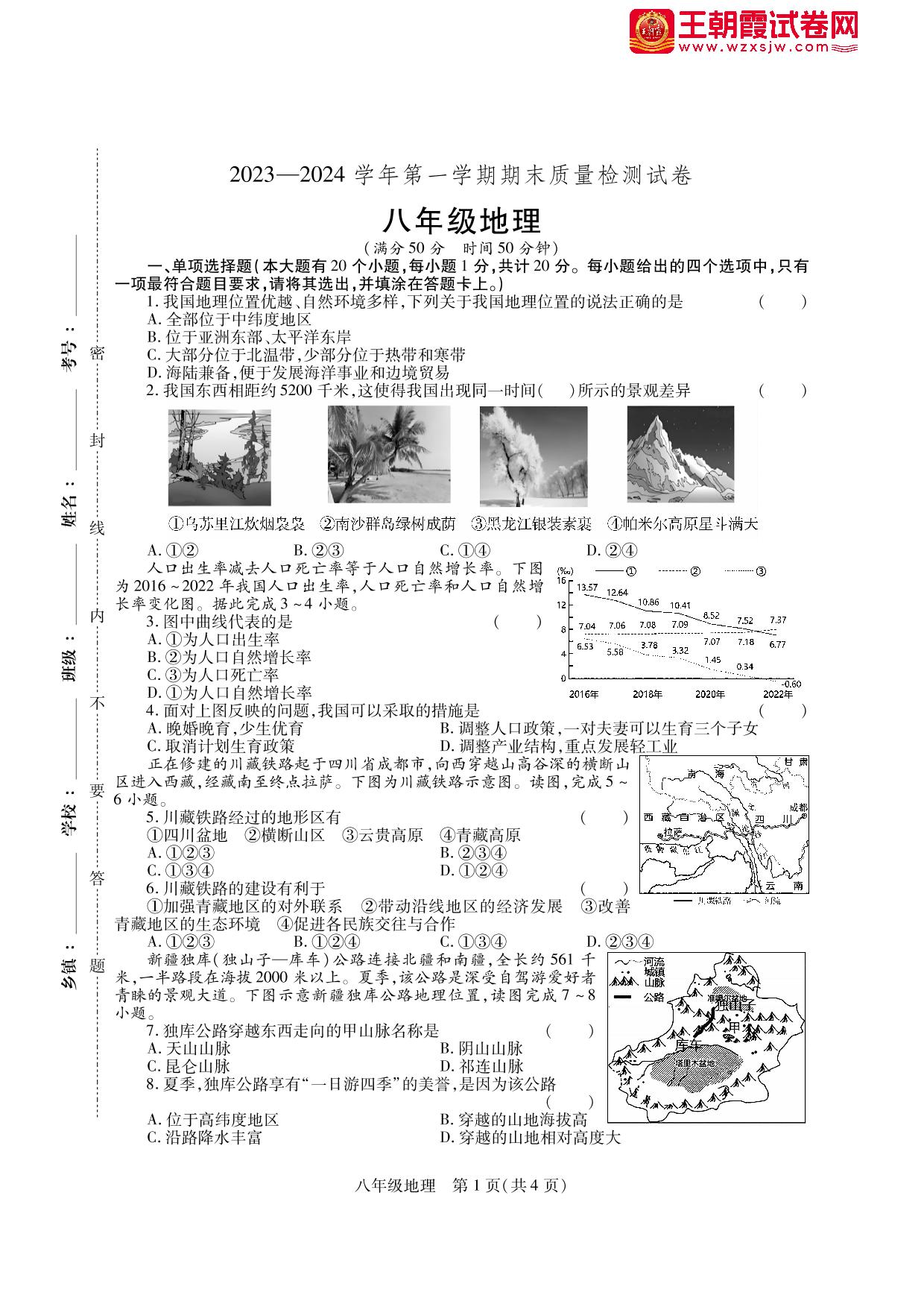 河南省洛阳市偃师区2023-2024学年第一学期期末质量检测试卷八年级地理(人教版)