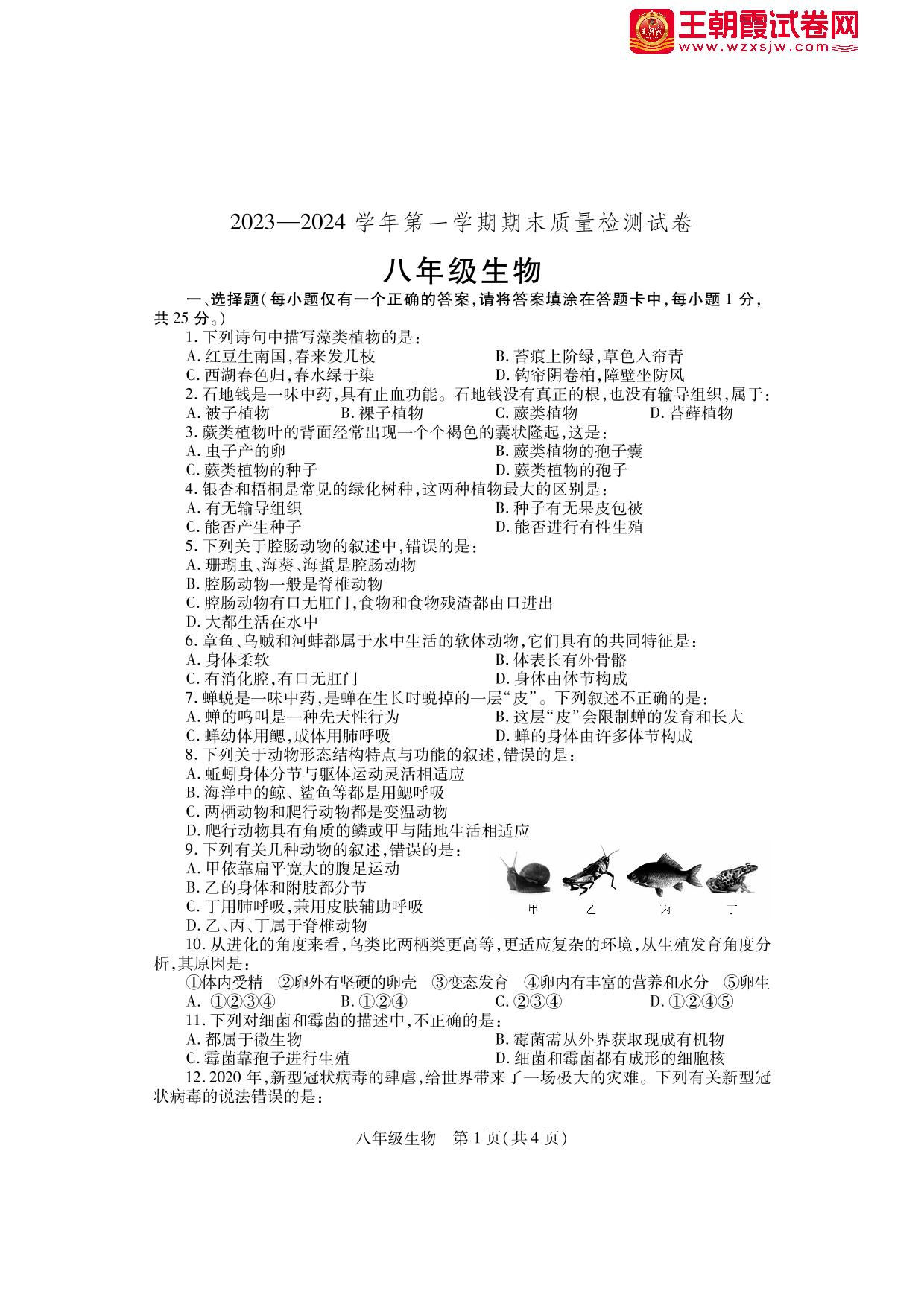 河南省洛阳市偃师区2023-2024学年第一学期期末质量检测试卷八年级生物(苏教版)