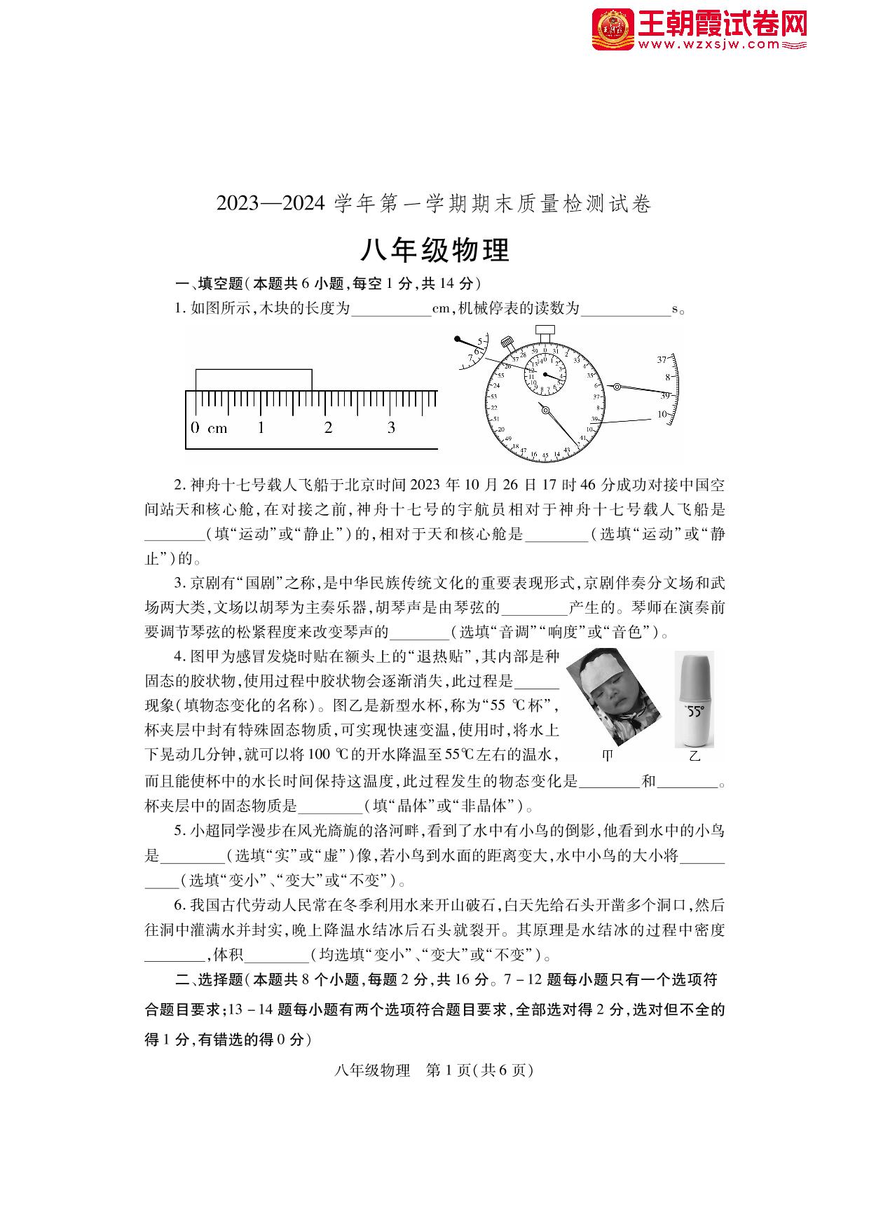 河南省洛阳市偃师区2023-2024学年第一学期期末质量检测试卷八年级物理(人教版)