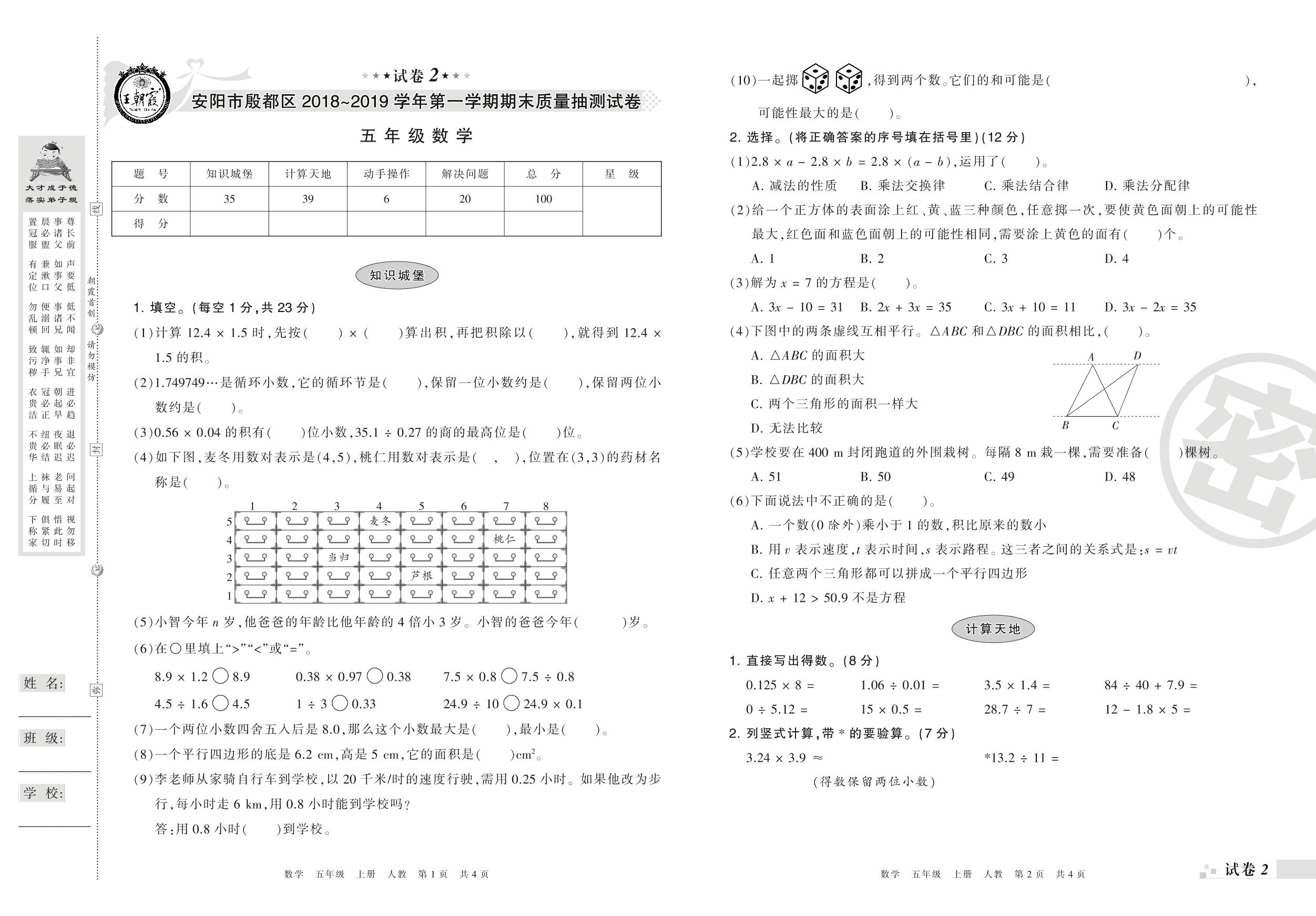 2018-2019学年第一学期安阳市殷都区五年级数学试卷(人教版)【2】