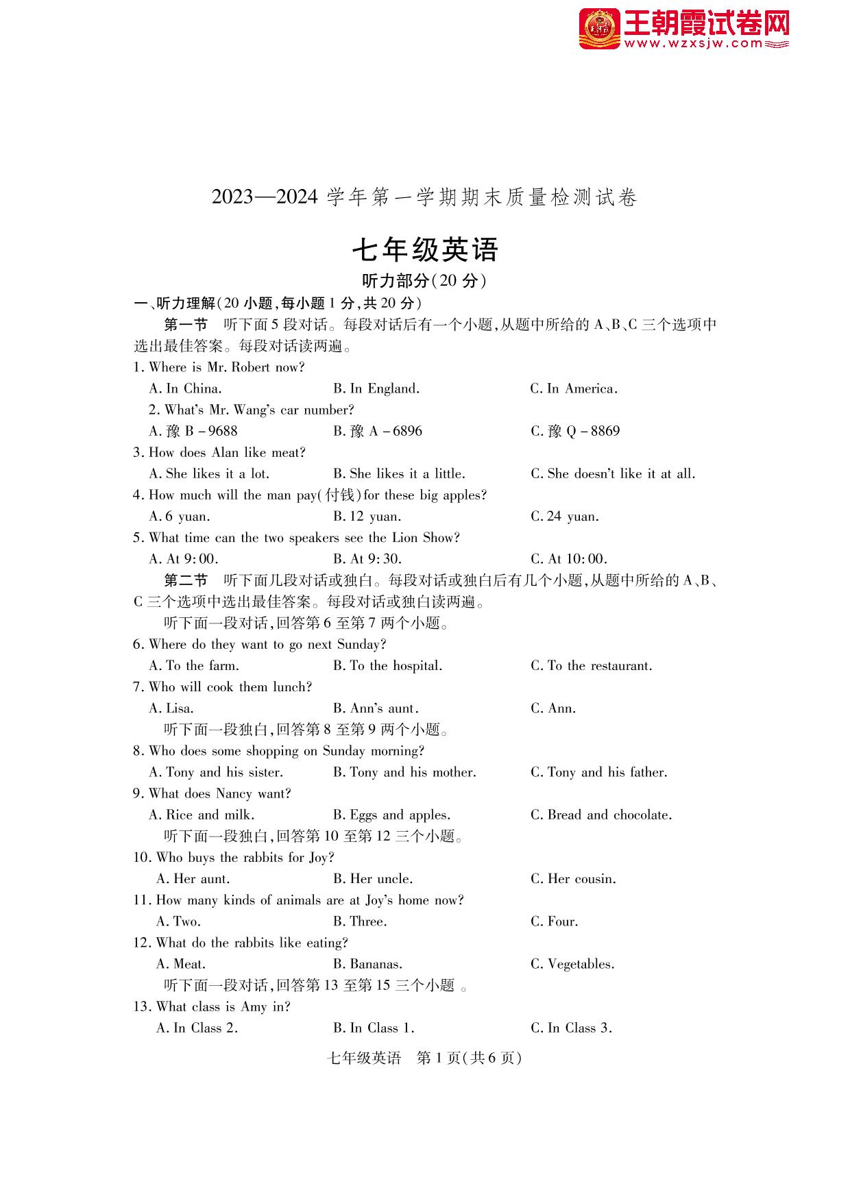河南省洛阳市偃师区2023-2024学年第一学期期末质量检测试卷七年级英语(新课标版)【无听力音频】