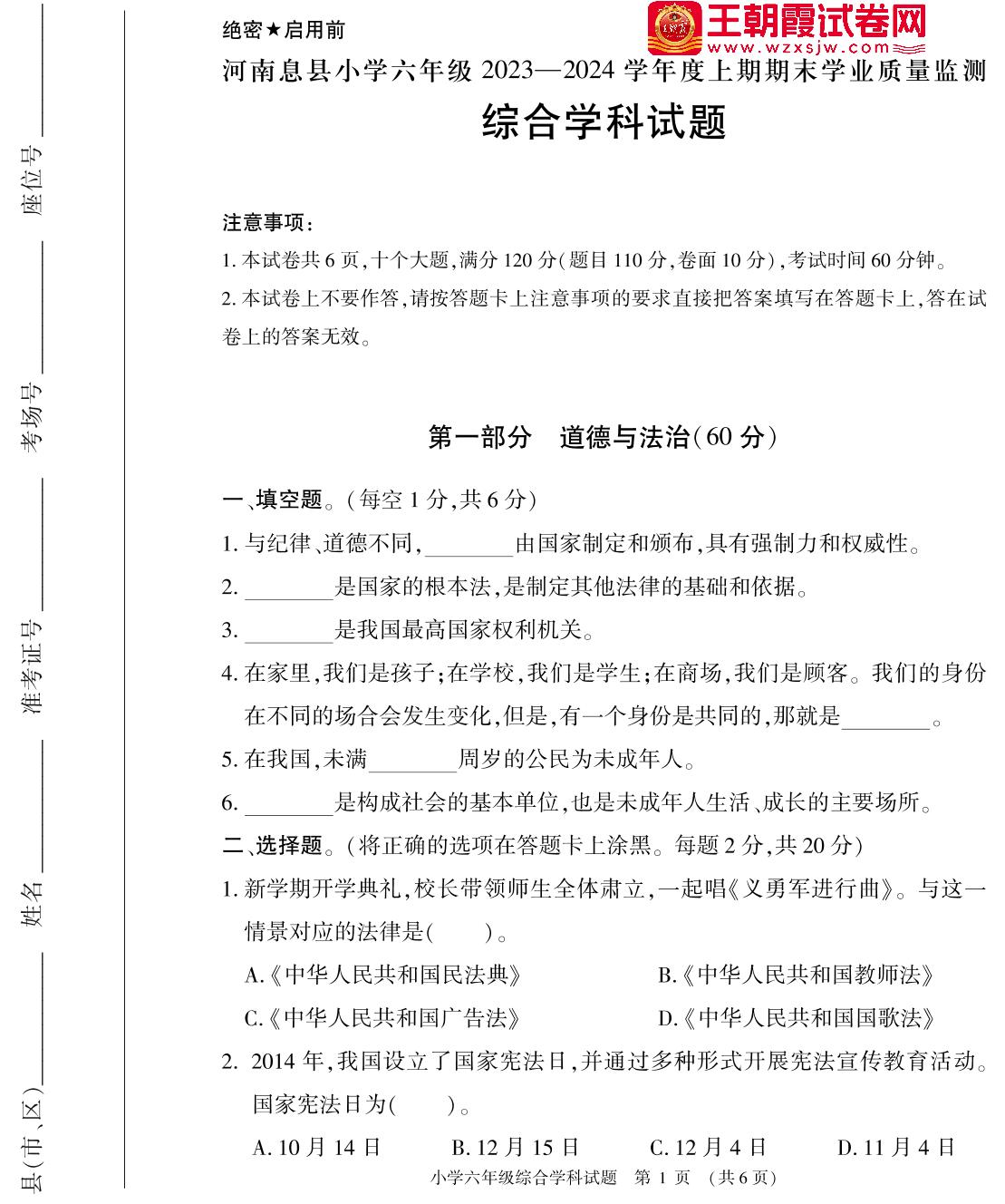 河南省信阳市息县2023-2024学年度上学期期末学业质量监测六年级道德与法治、科学综合试题
