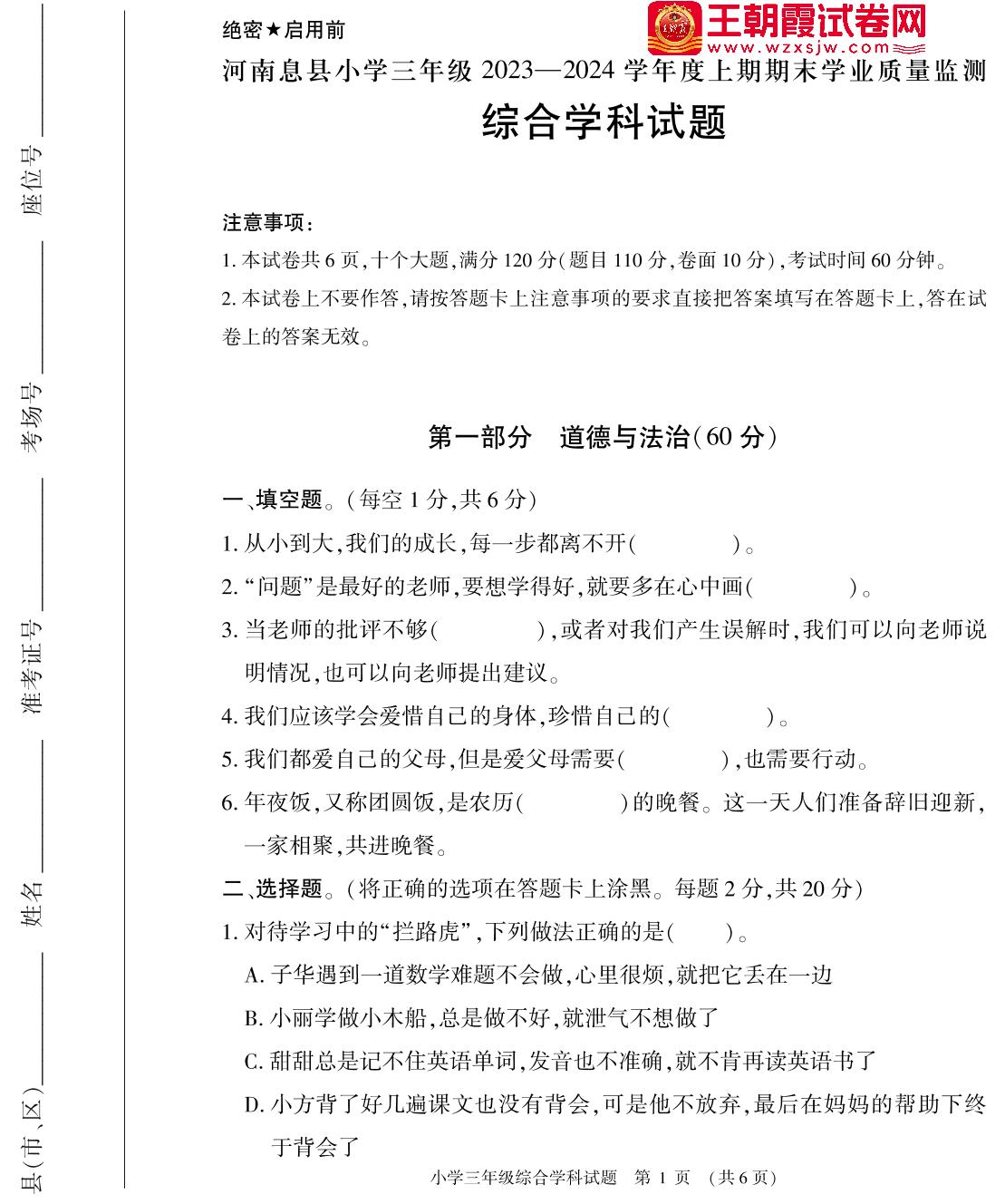 河南省信阳市息县2023-2024学年度上学期期末学业质量监测三年级道德与法治、科学综合试题