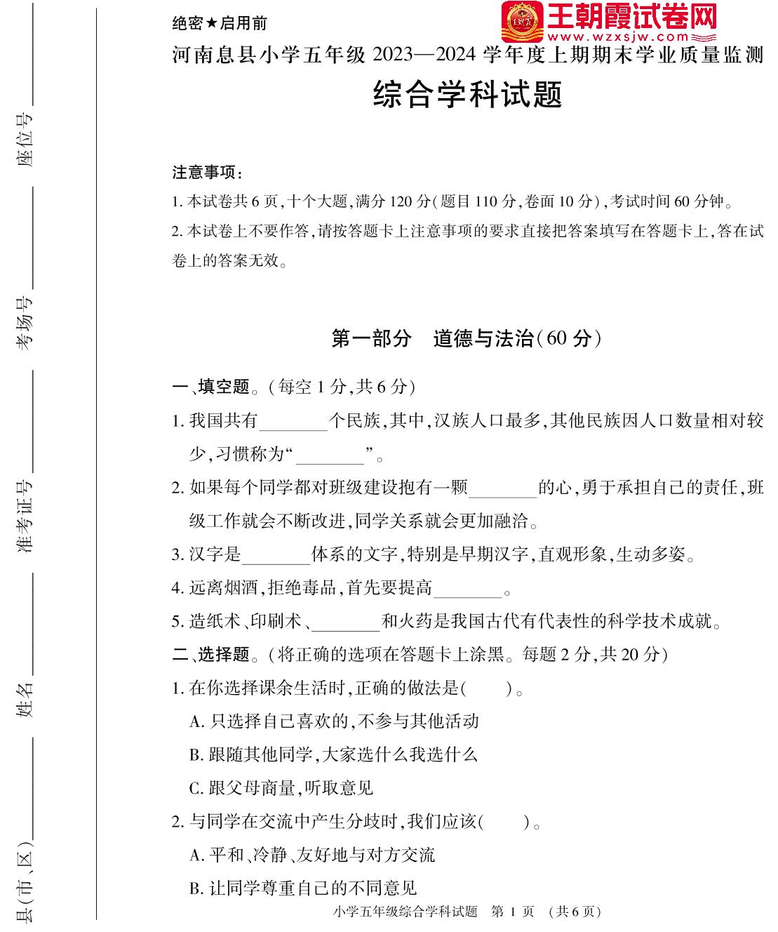 河南省信阳市息县2023-2024学年度上学期期末学业质量监测五年级道德与法治、科学综合试题