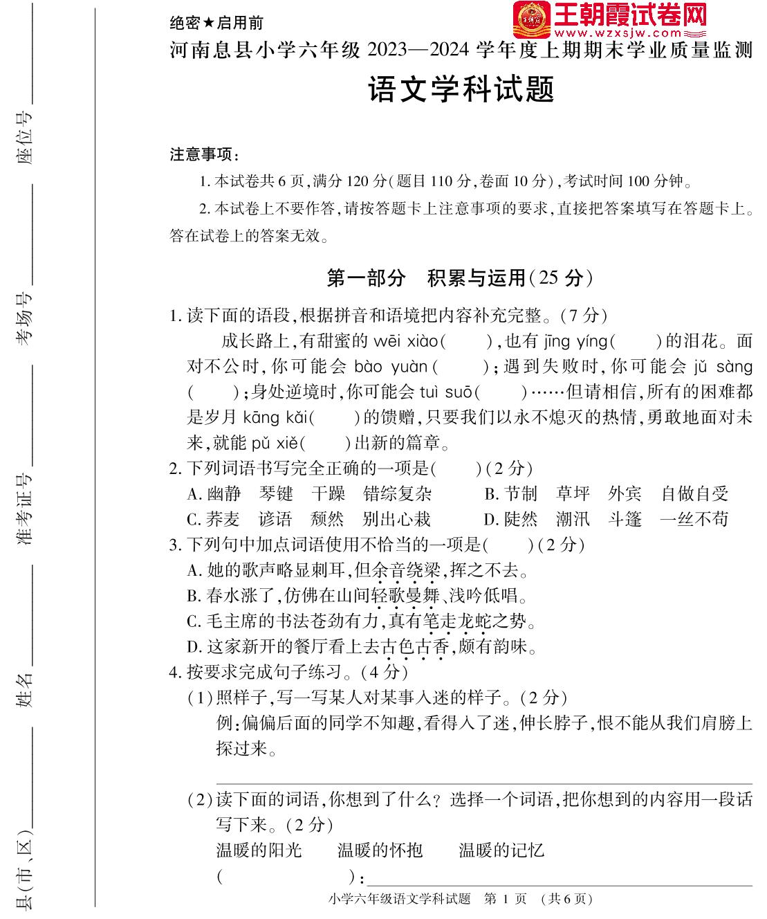 河南省信阳市息县2023-2024学年度上学期期末学业质量监测试题六年级语文(人教版)