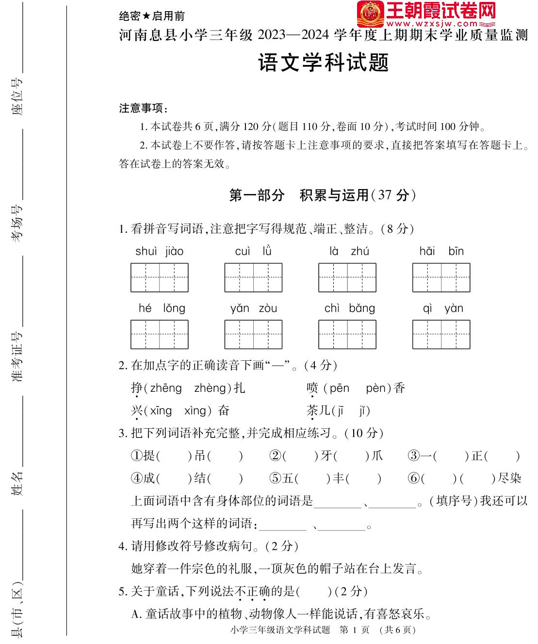 河南省信阳市息县2023-2024学年度上学期期末学业质量监测试题三年级语文(人教版)