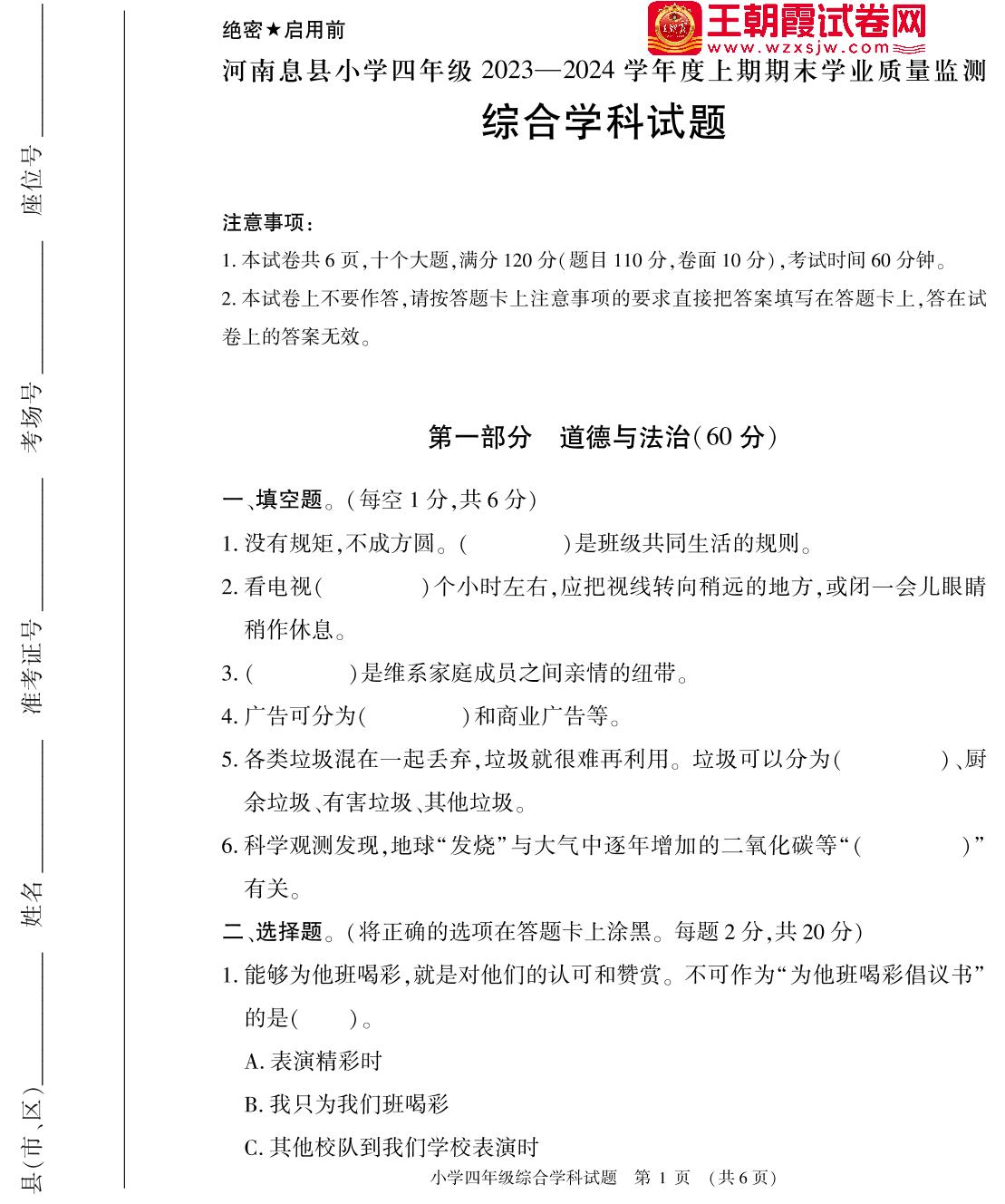 河南省信阳市息县2023-2024学年度上学期期末学业质量监测四年级道德与法治、科学综合试题