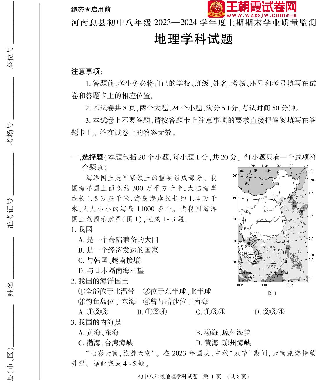 河南省信阳市息县2023-2024学年度上学期期末学业质量监测试题八年级地理(湘教版)
