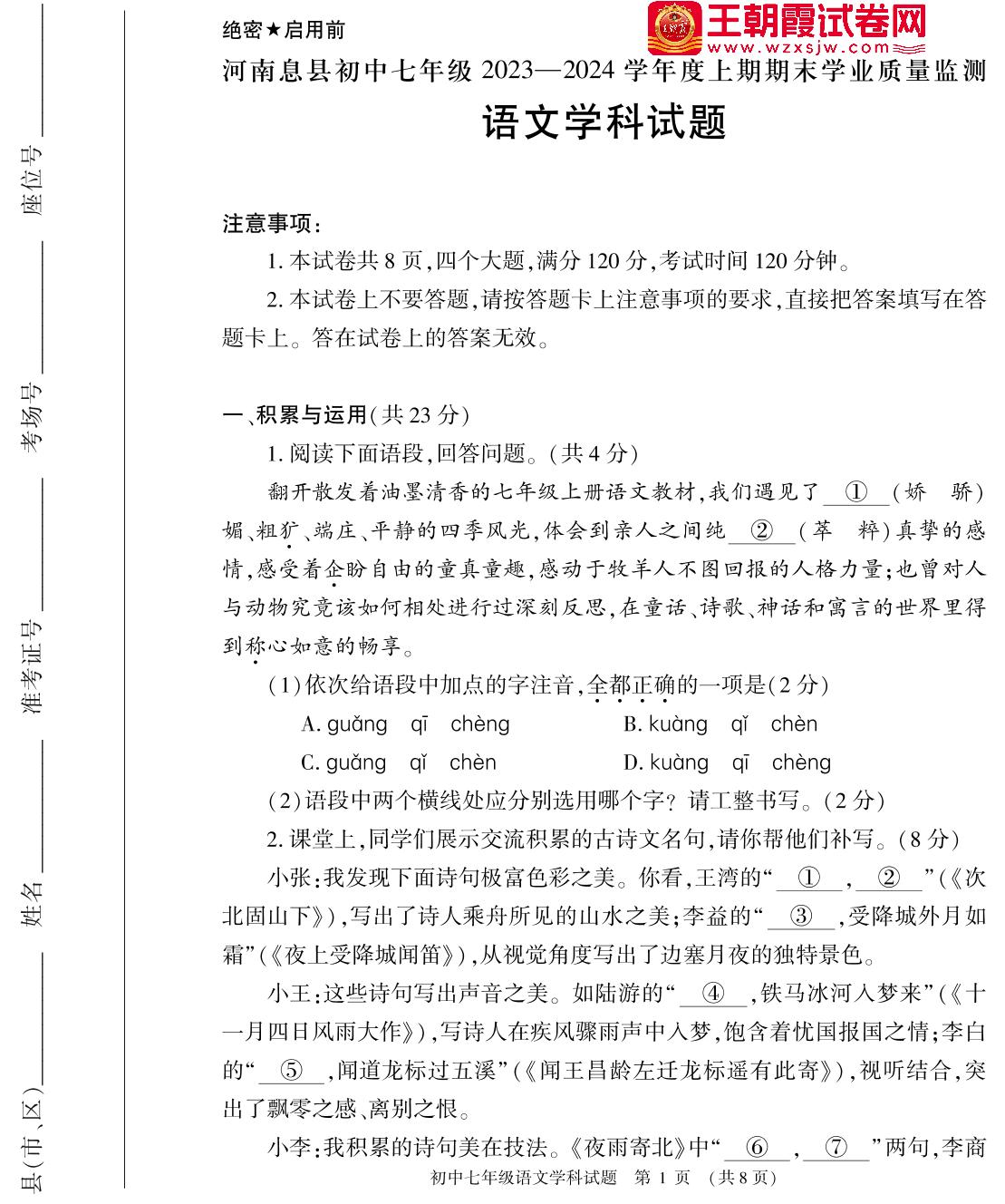 河南省信阳市息县2023-2024学年度上学期期末学业质量监测试题七年级语文(人教版)