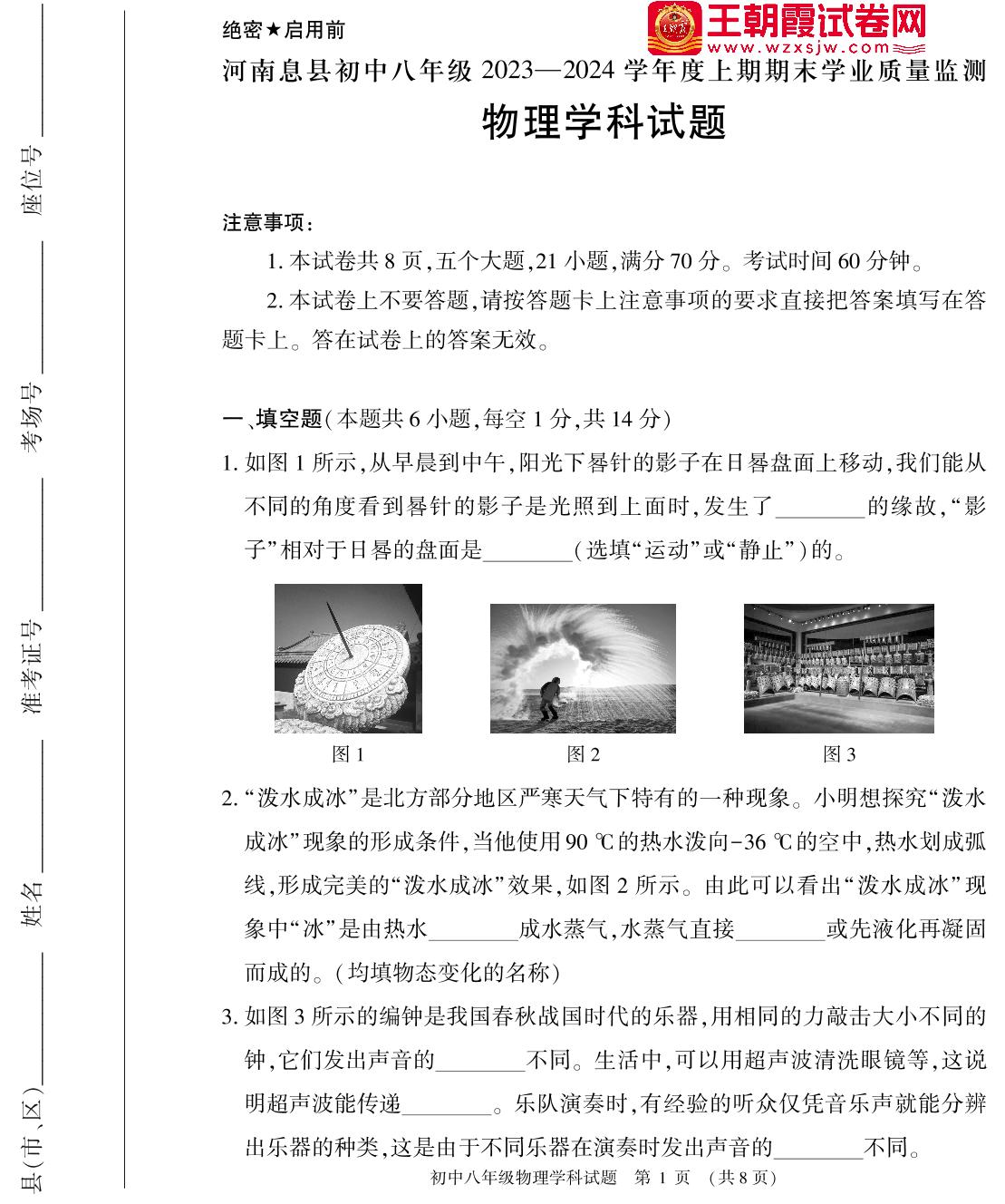 河南省信阳市息县2023-2024学年度上学期期末学业质量监测试题八年级物理(人教版)