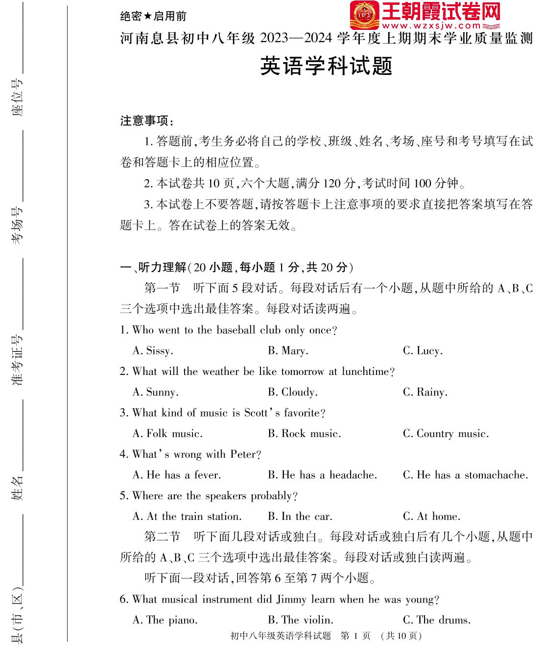 河南省信阳市息县2023-2024学年度上学期期末学业质量监测试题八年级英语(新课标版)【无听力音频】