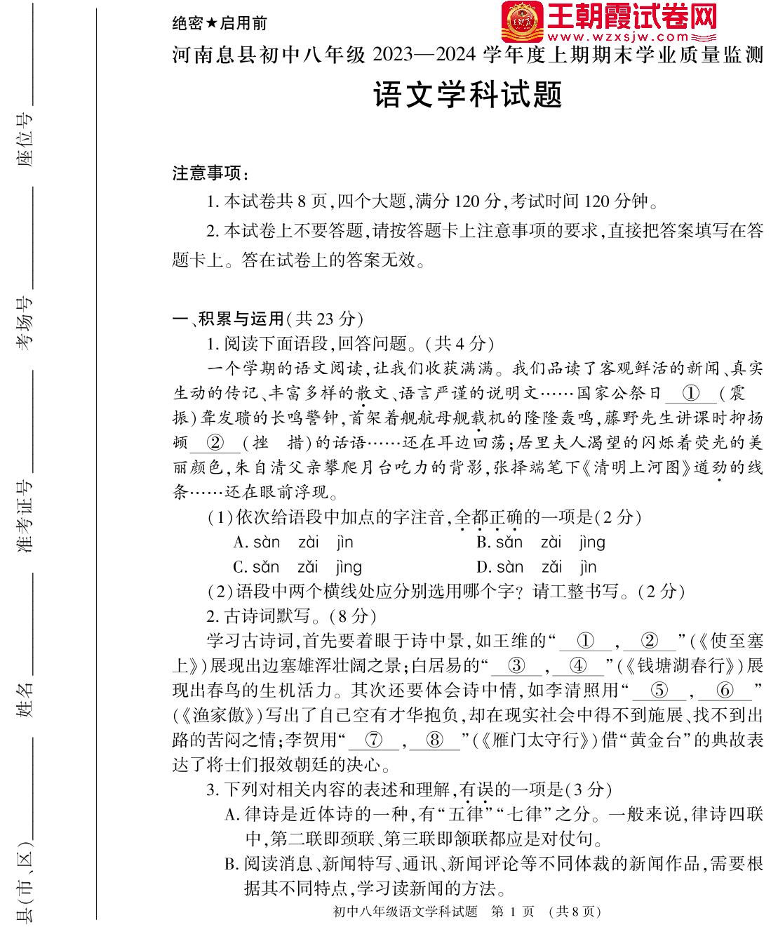 河南省信阳市息县2023-2024学年度上学期期末学业质量监测试题八年级语文(人教版)