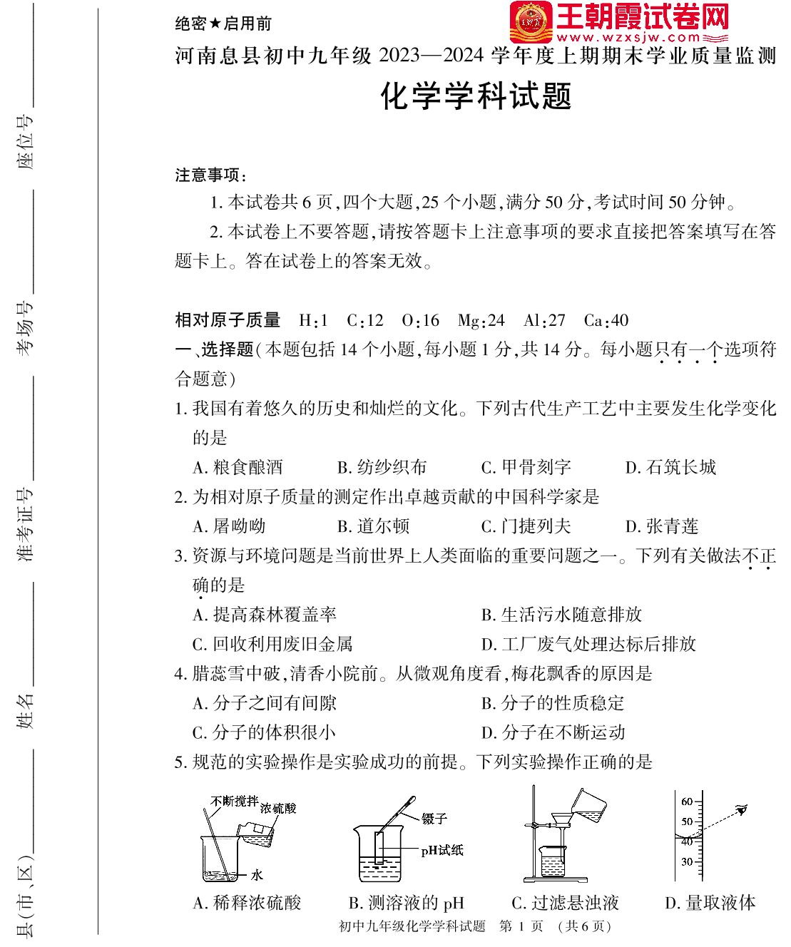 河南省信阳市息县2023-2024学年度上学期期末学业质量监测试题九年级化学(人教版)