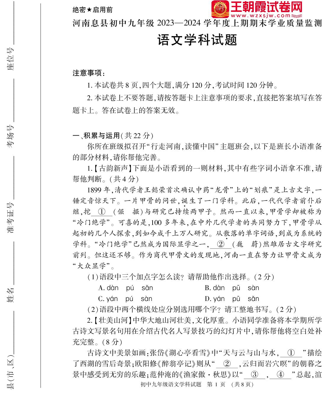 河南省信阳市息县2023-2024学年度上学期期末学业质量监测试题九年级语文(人教版)