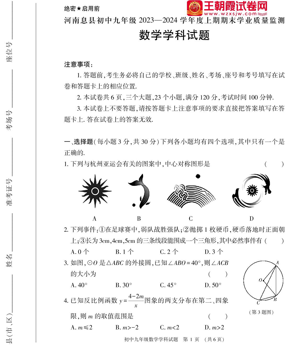 河南省信阳市息县2023-2024学年度上学期期末学业质量监测试题九年级数学(人教版)