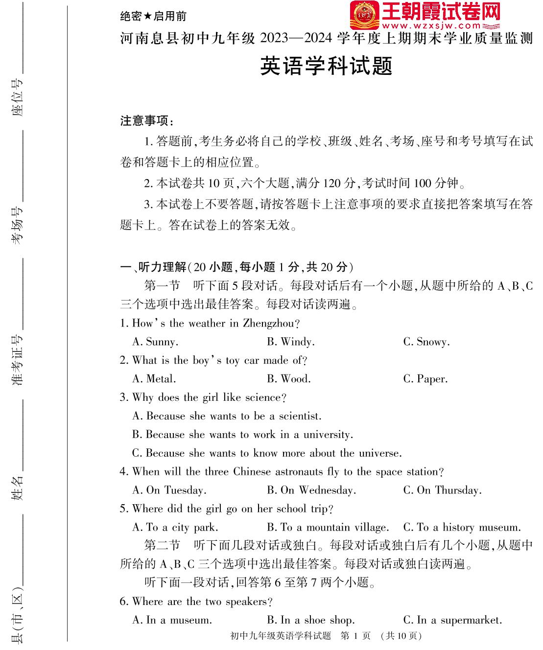 河南省信阳市息县2023-2024学年度上学期期末学业质量监测试题九年级英语(新课标版)【无听力音频】