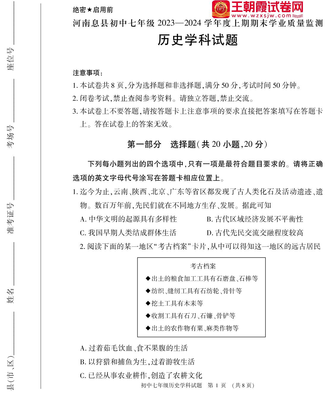 河南省信阳市息县2023-2024学年度上学期期末学业质量监测试题七年级历史(人教版)