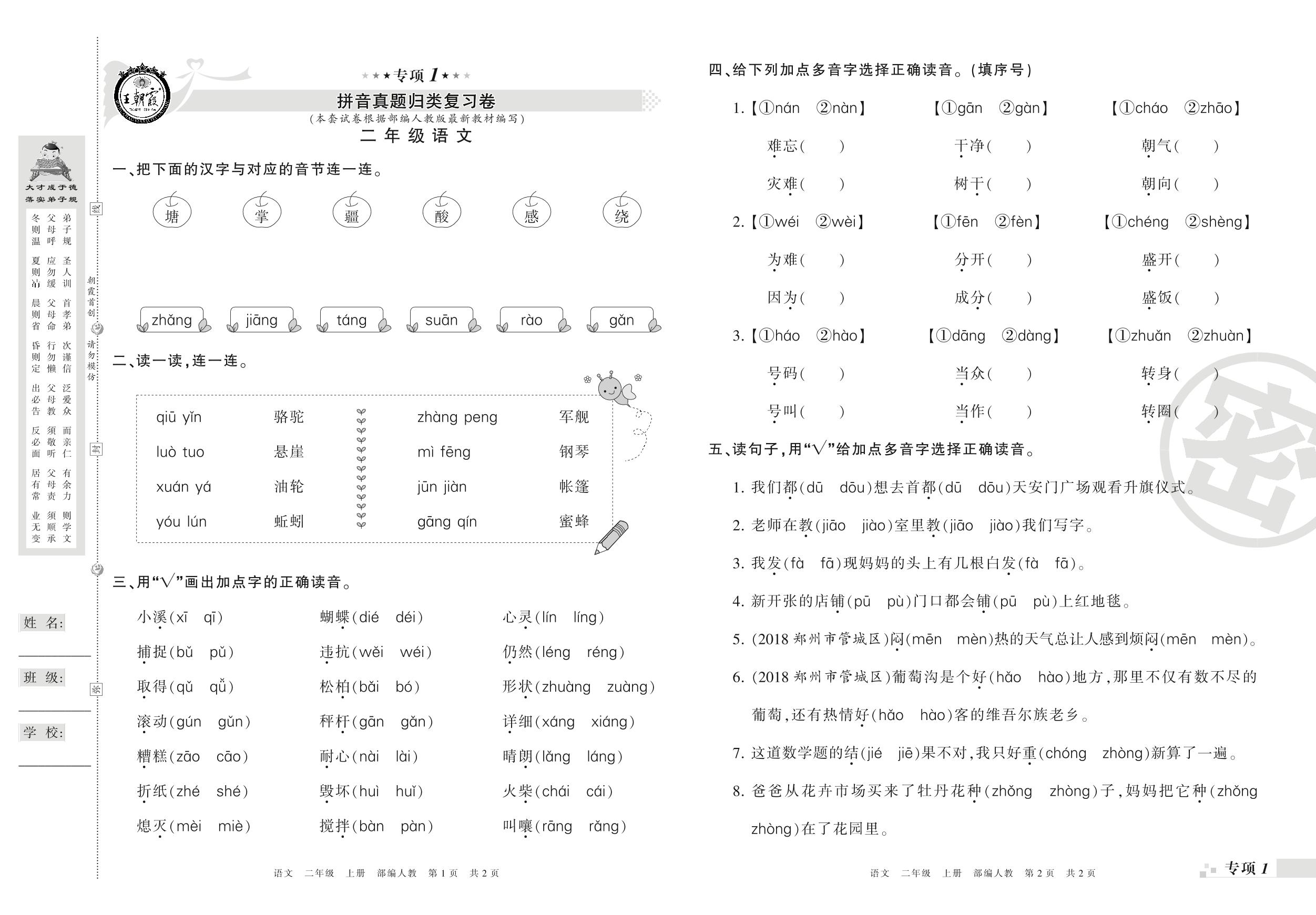 王朝霞期末专项卷——拼音、汉字真题归类复习卷二年级上册语文(人教版)_R21080171158【0】
