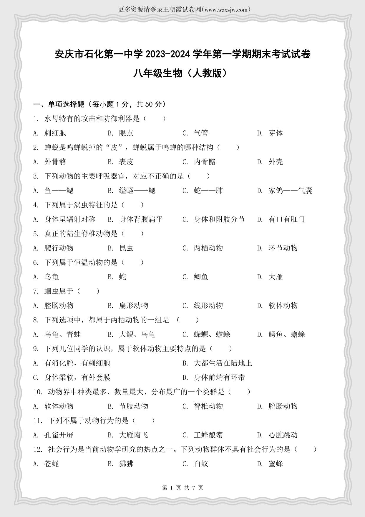 安徽省安庆市石化第一中学2023-2024学年度第一学期期末考试试卷八年级生物(人教版)