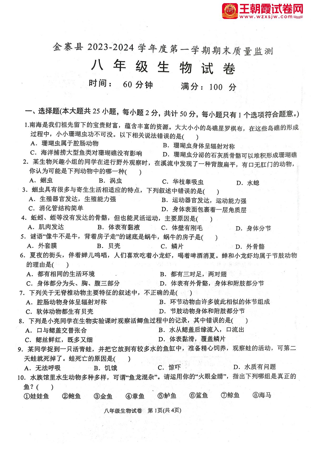 安徽省六安市金寨县2023-2024学年度第一学期期末质量监测八年级生物(人教版)