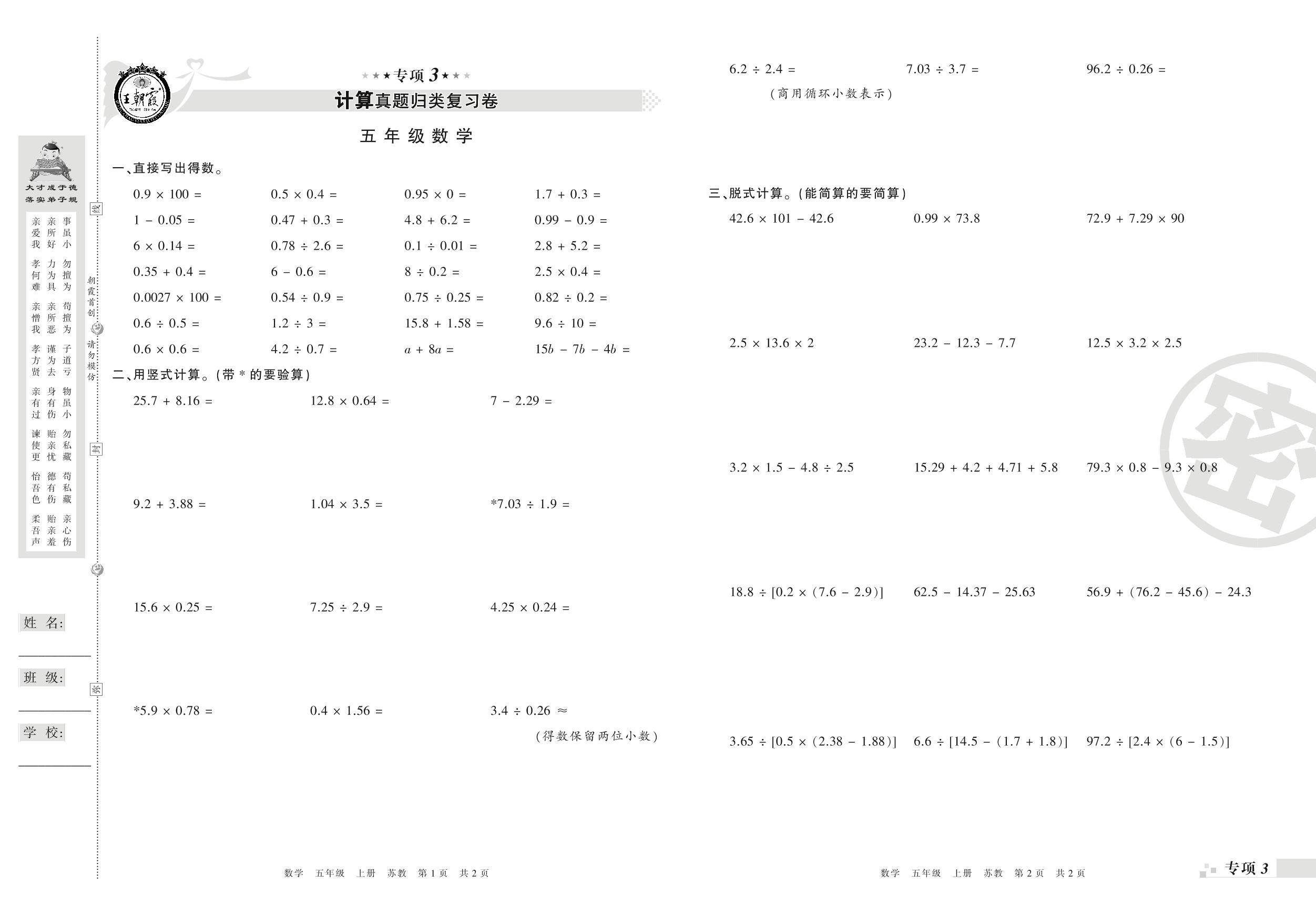 王朝霞期末专项卷——计算、解决问题真题归类复习五年级上册数学(苏教版)_R210804173211【0】