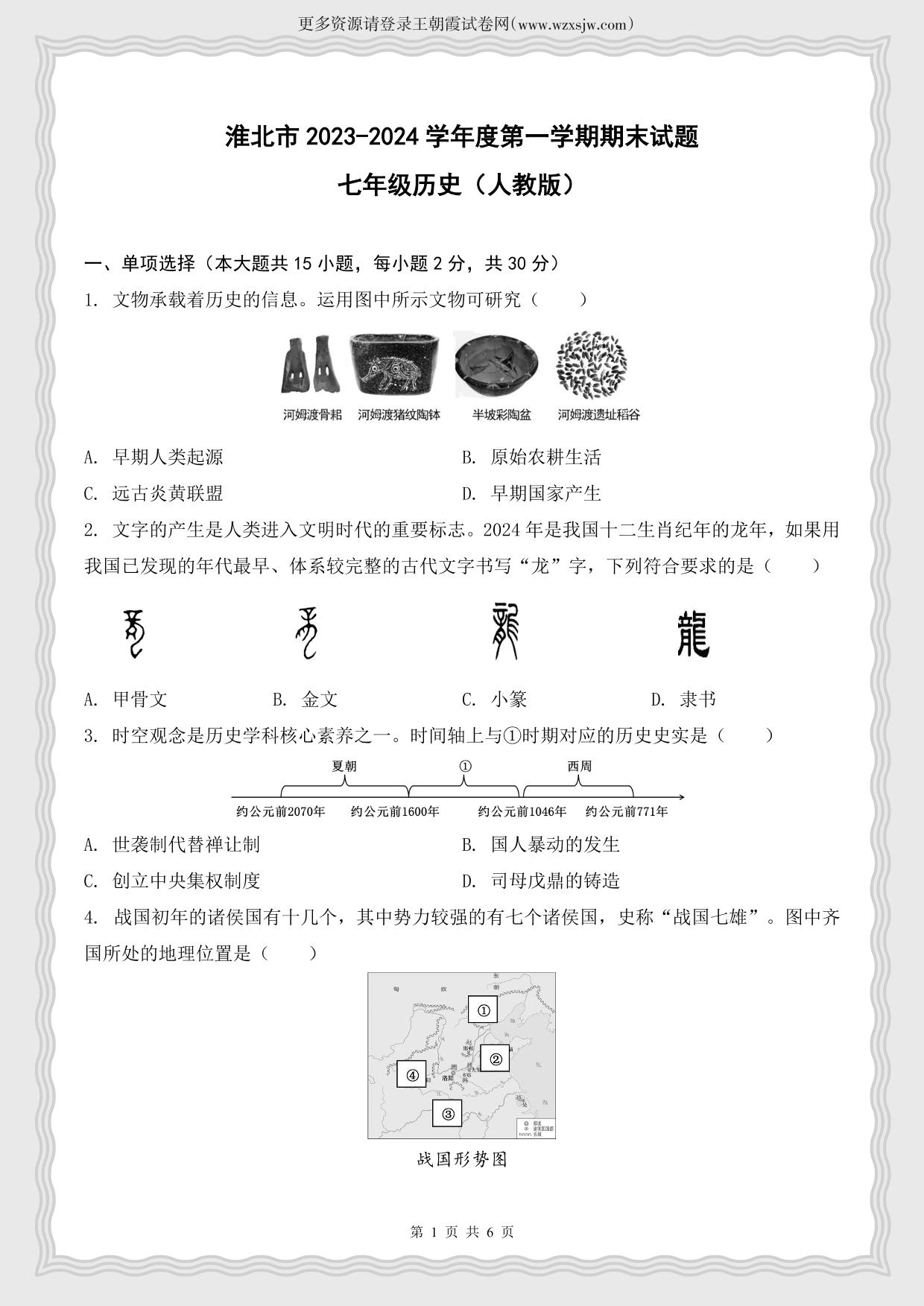 安徽省淮北市2023-2024学年度第一学期期末试题七年级历史(人教版)