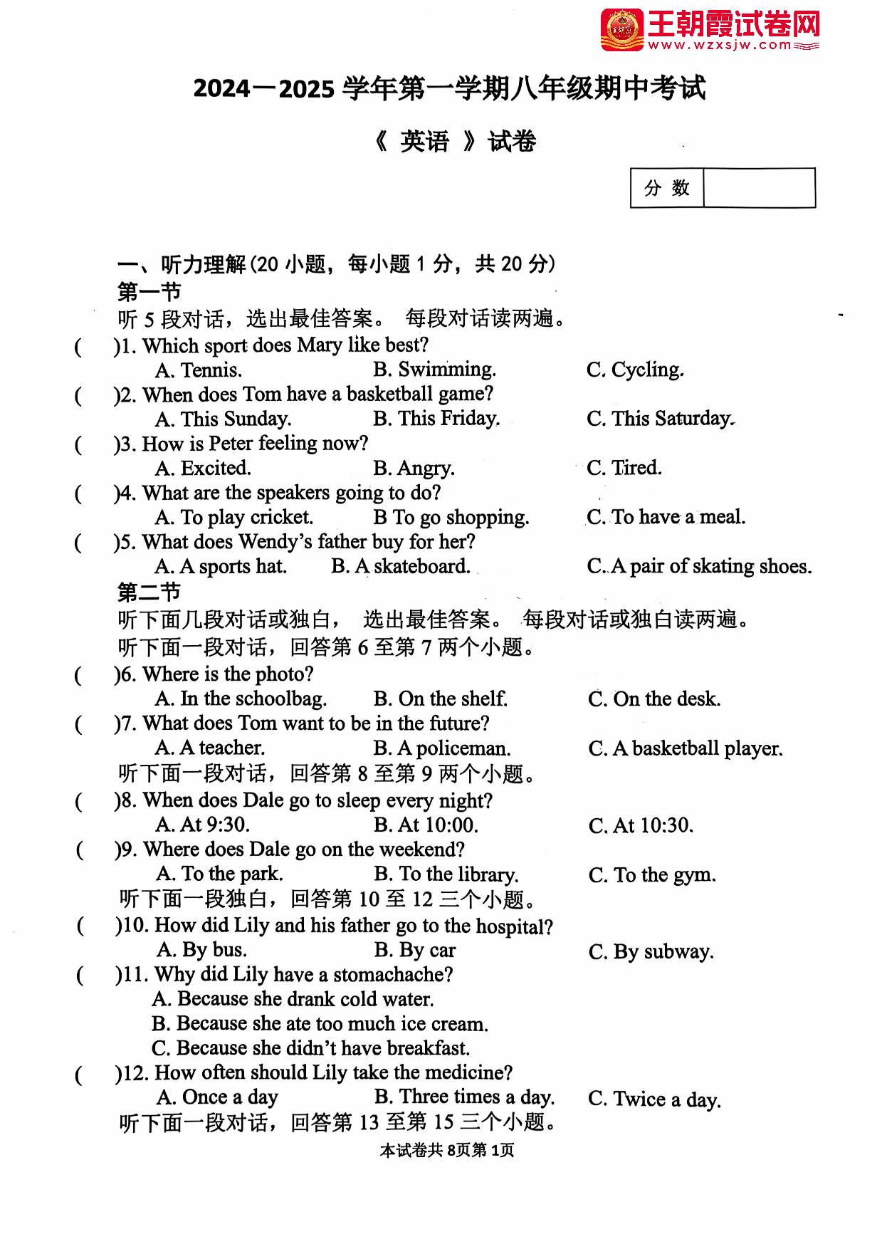 河南师范大学附属中学2024-2025学年第一学期期中考试试卷八年级英语(新课标版)