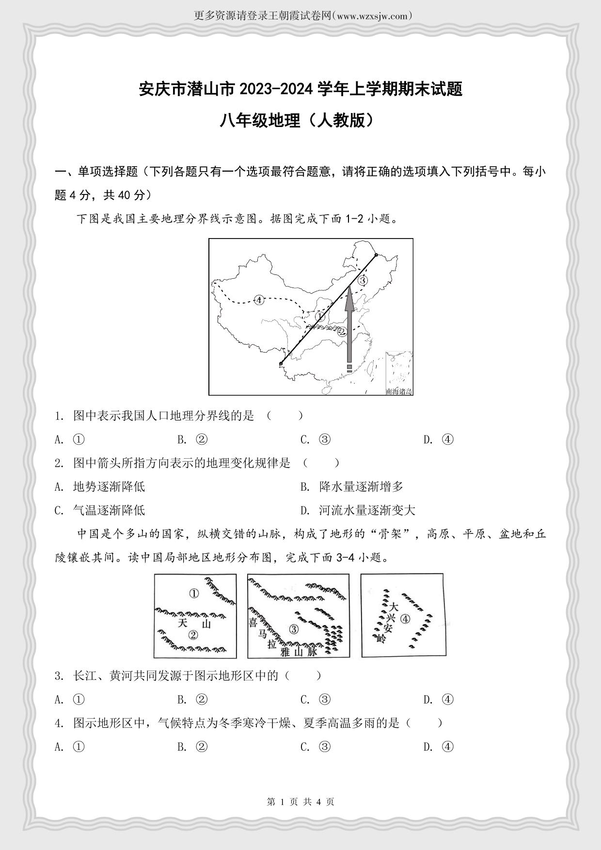 安徽省安庆市潜山市2023-2024学年上学期期末试题八年级地理(人教版)