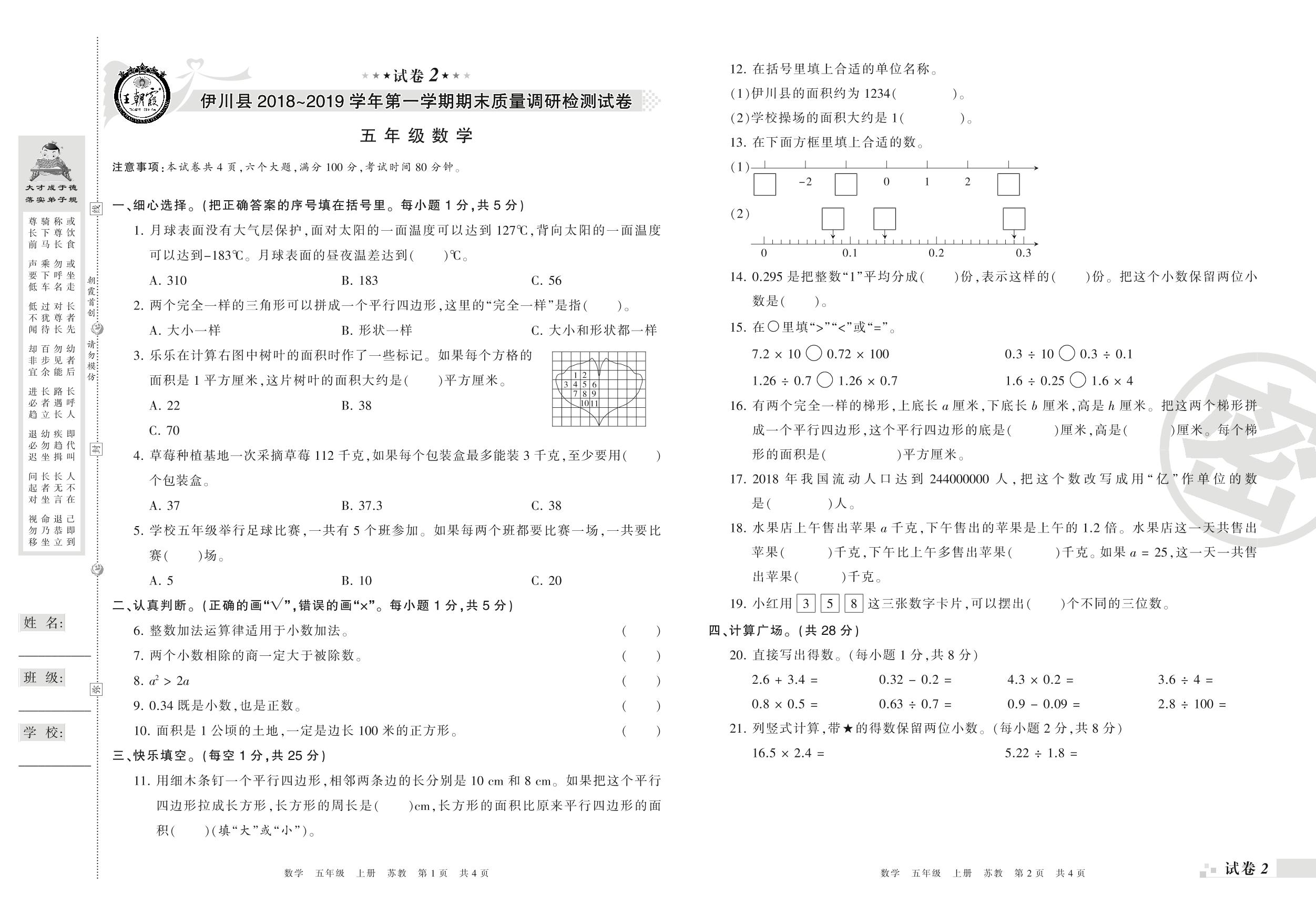 2018-2019学年第一学期洛阳市伊川县五年级数学试卷(苏教版)【2】