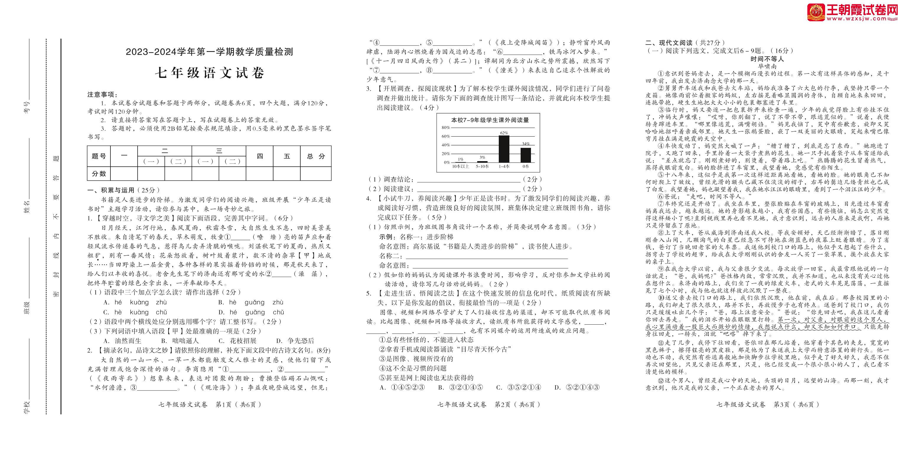河南省安阳市殷都区2023-2024学年第一学期期末教学质量检测试卷七年级语文(人教版)