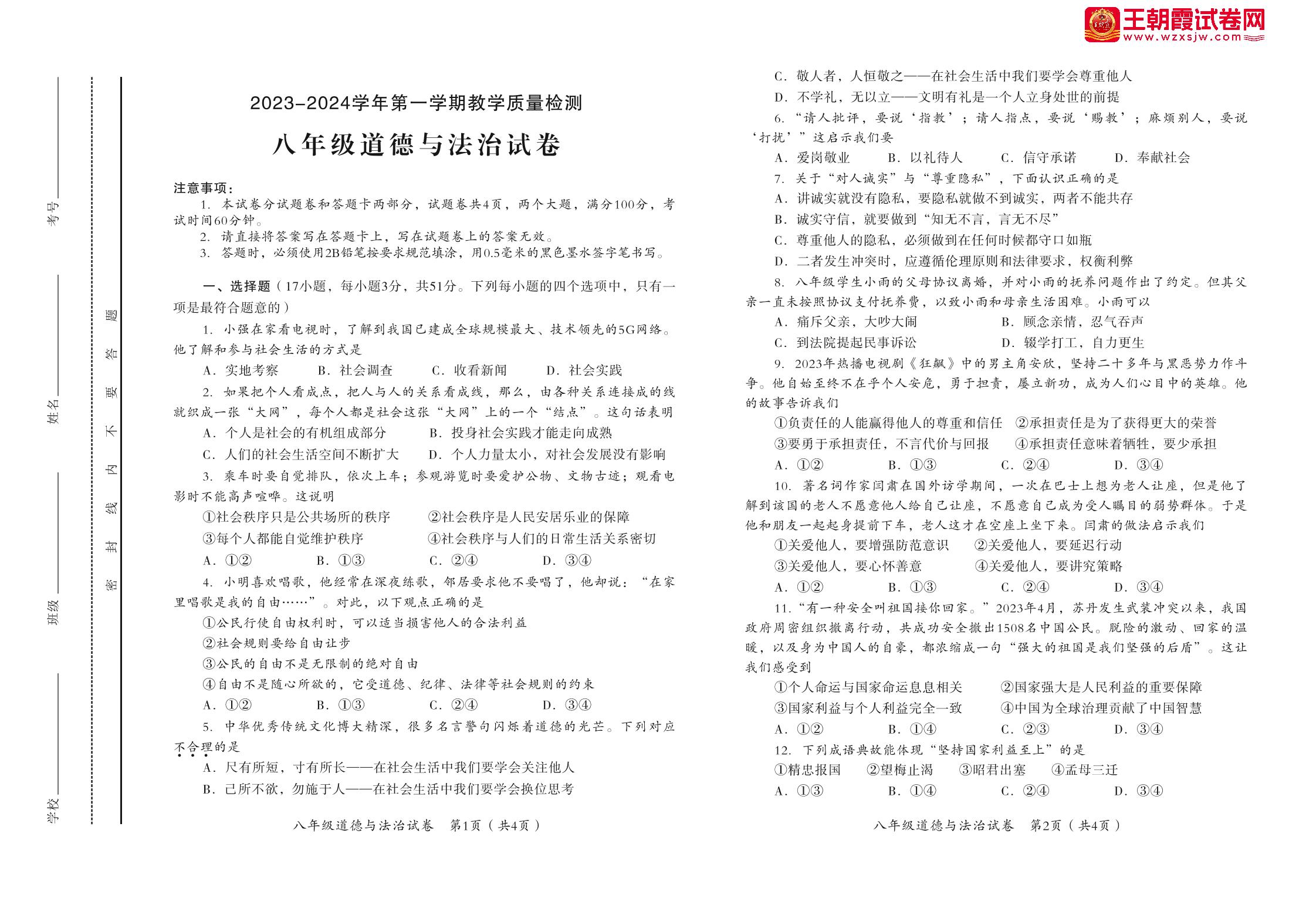 八年级道德与法治人教版上册期末卷