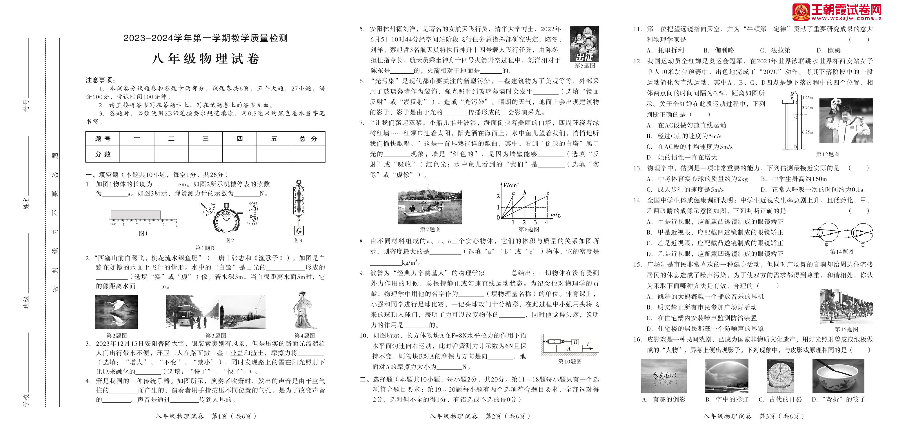 河南省安阳市殷都区2023-2024学年第一学期期末教学质量检测试卷八年级物理(沪科版)