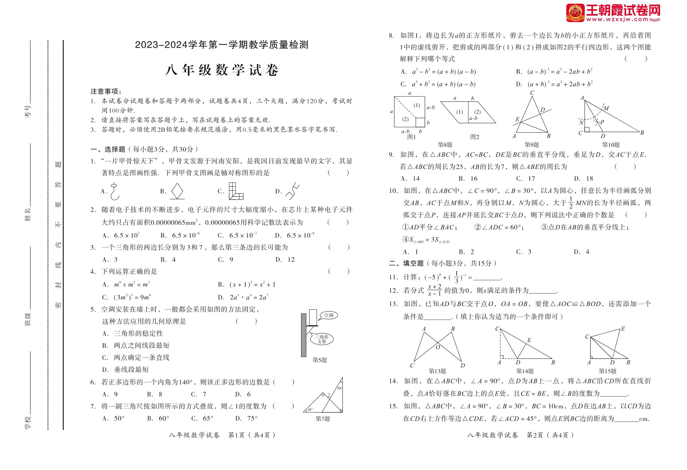 河南省安阳市殷都区2023-2024学年第一学期期末教学质量检测试卷八年级数学(人教版)
