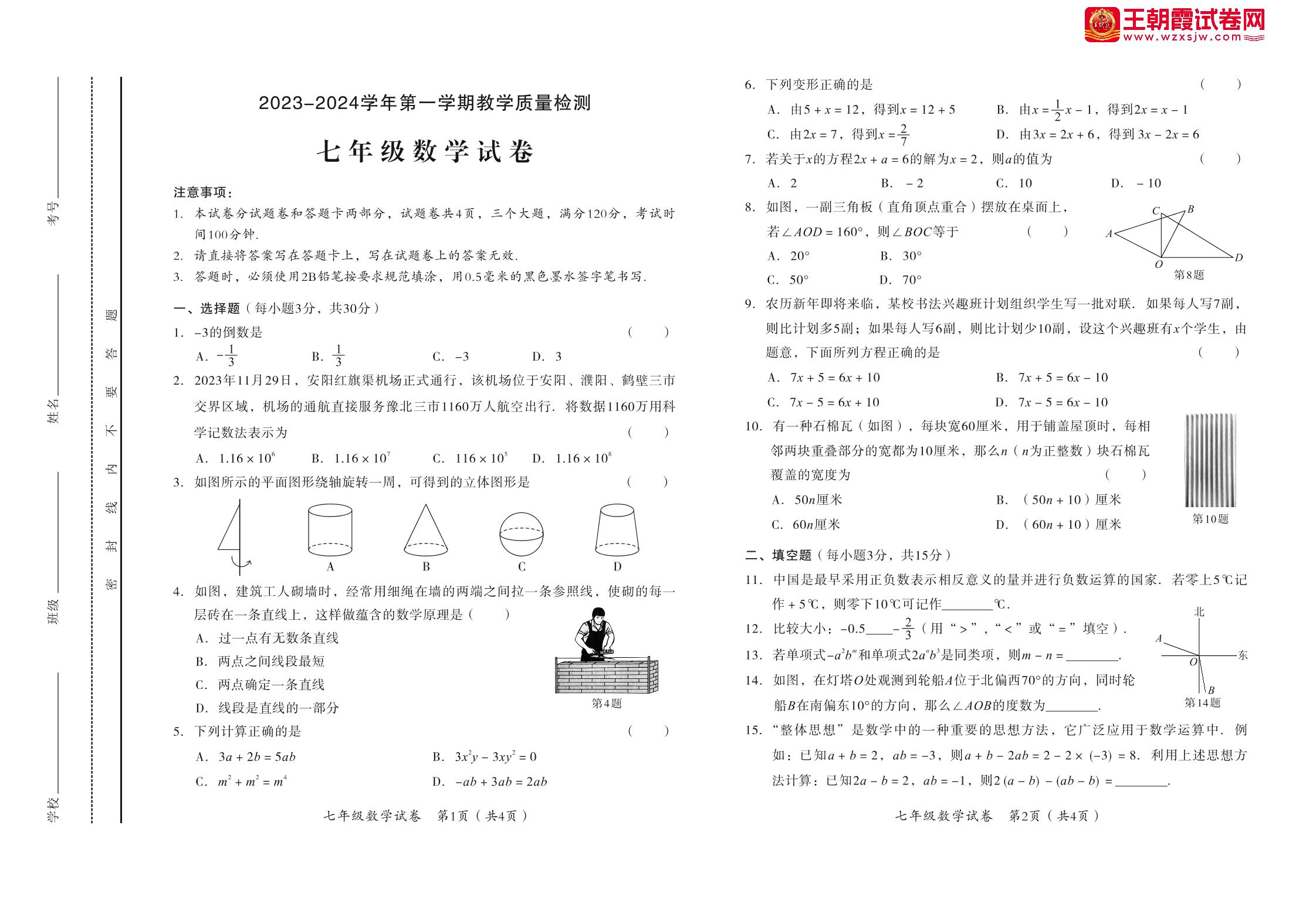 河南省安阳市殷都区2023-2024学年第一学期期末教学质量检测试卷七年级数学(人教版)