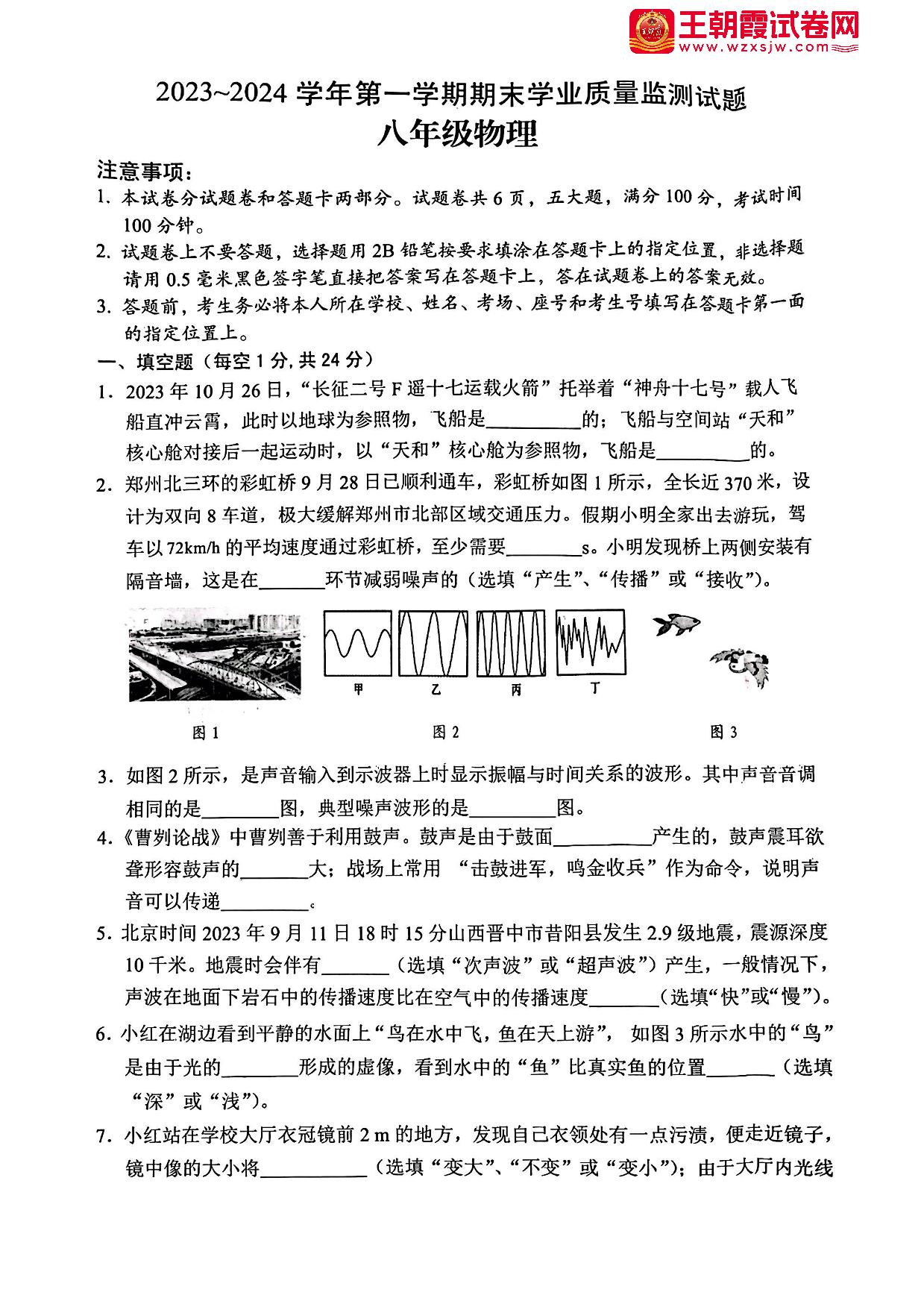 河南省安阳市文峰区2023-2024学年第一学期期末学业质量监测试题八年级物理(沪科版)