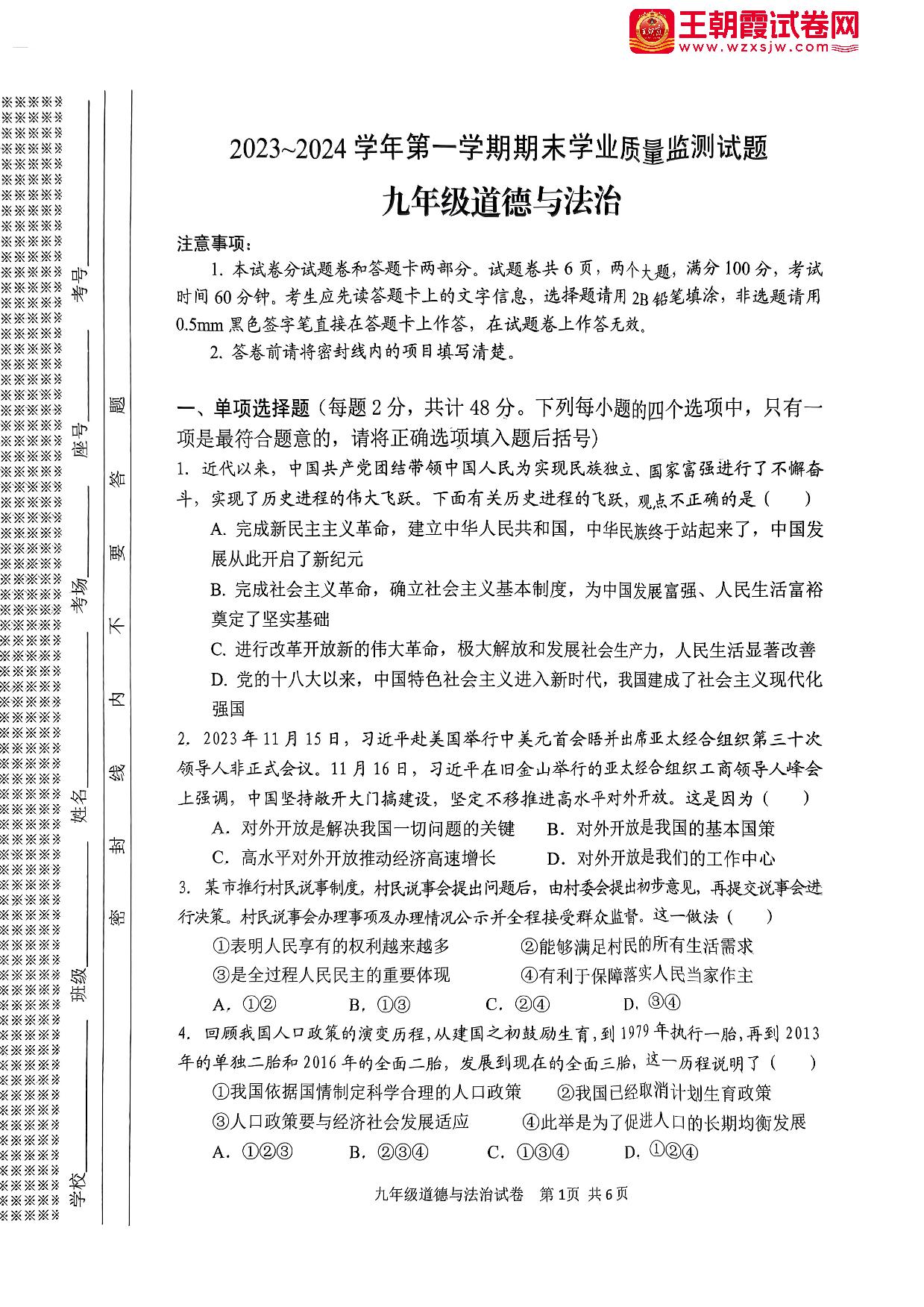 河南省安阳市文峰区2023-2024学年第一学期期末学业质量监测试题九年级道德与法治(人教版)
