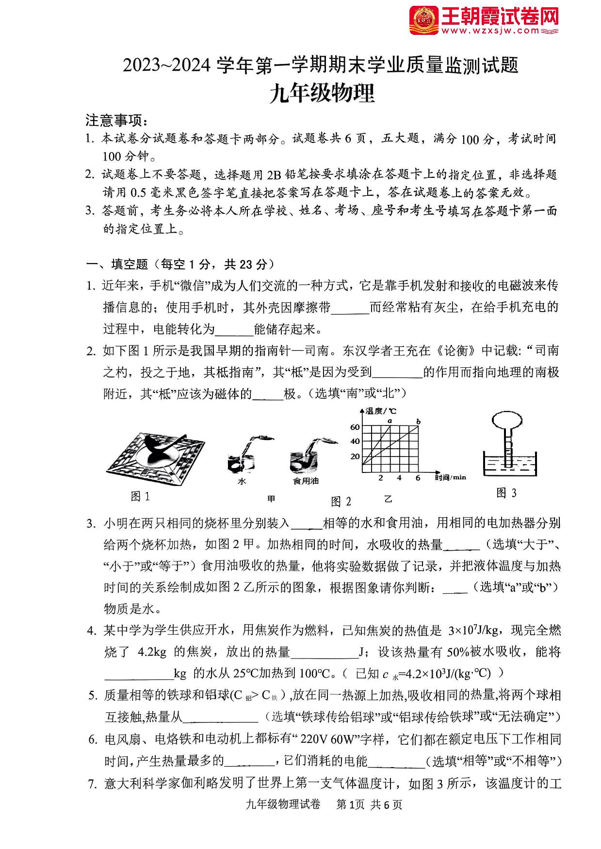 河南省安阳市文峰区2023-2024学年第一学期期末学业质量监测试题九年级物理(沪科版)