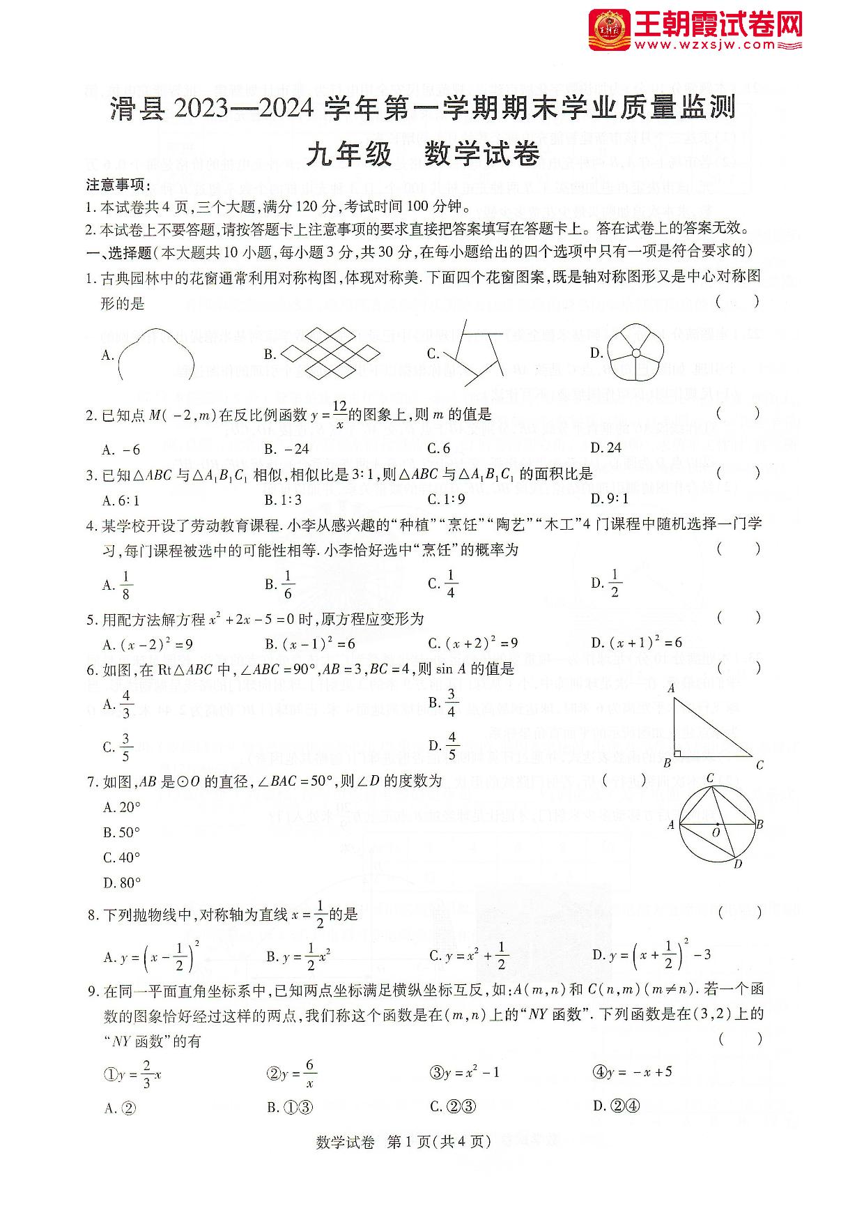 河南省安阳市滑县2023-2024学年第一学期期末学业质量监测试卷九年级数学(人教版)