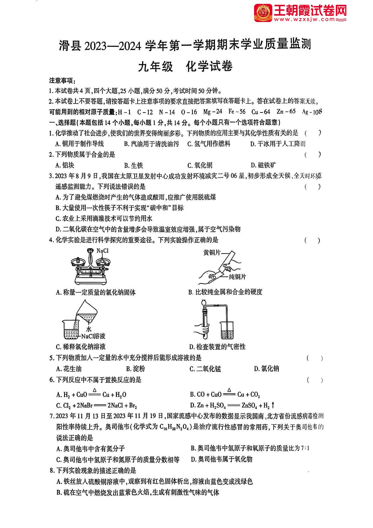 河南省安阳市滑县2023-2024学年第一学期期末学业质量监测试卷九年级化学(人教版)
