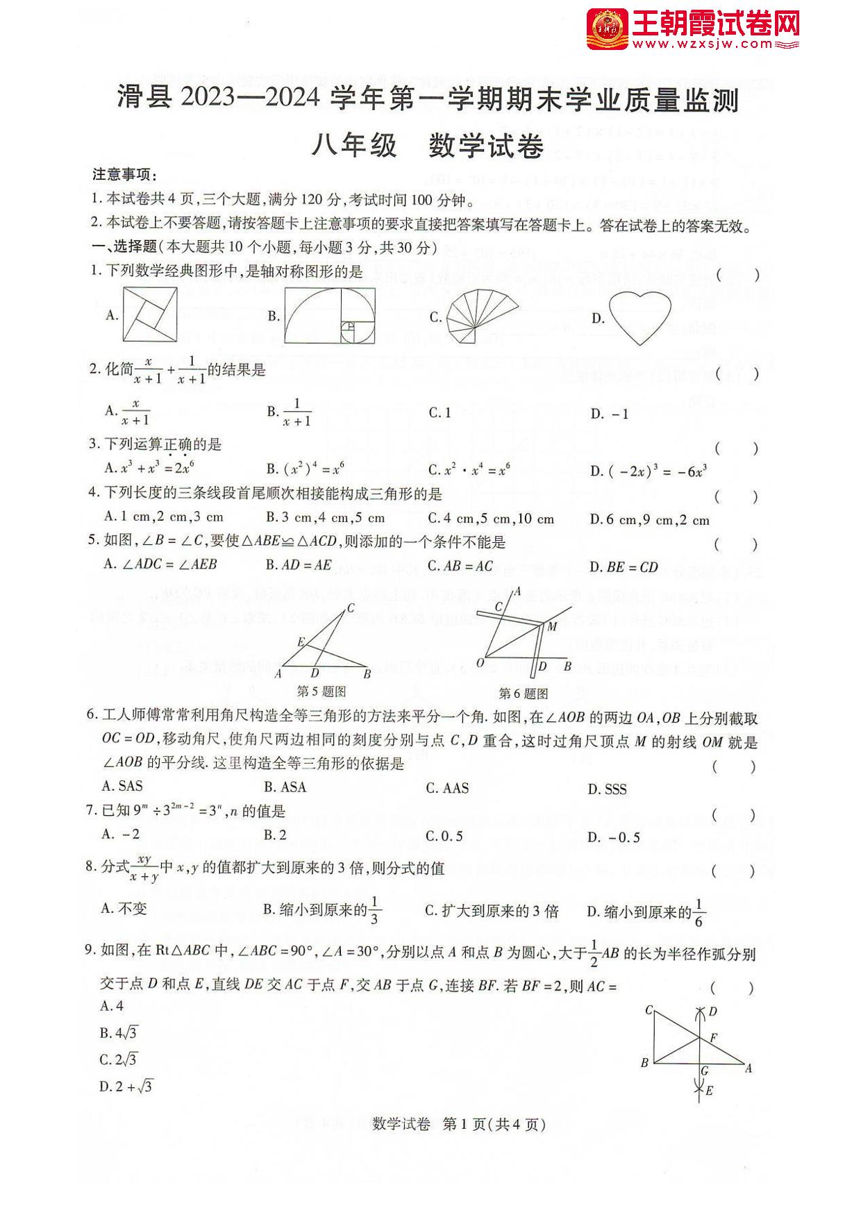 河南省安阳市滑县2023-2024学年第一学期期末学业质量监测试卷八年级数学(人教版)