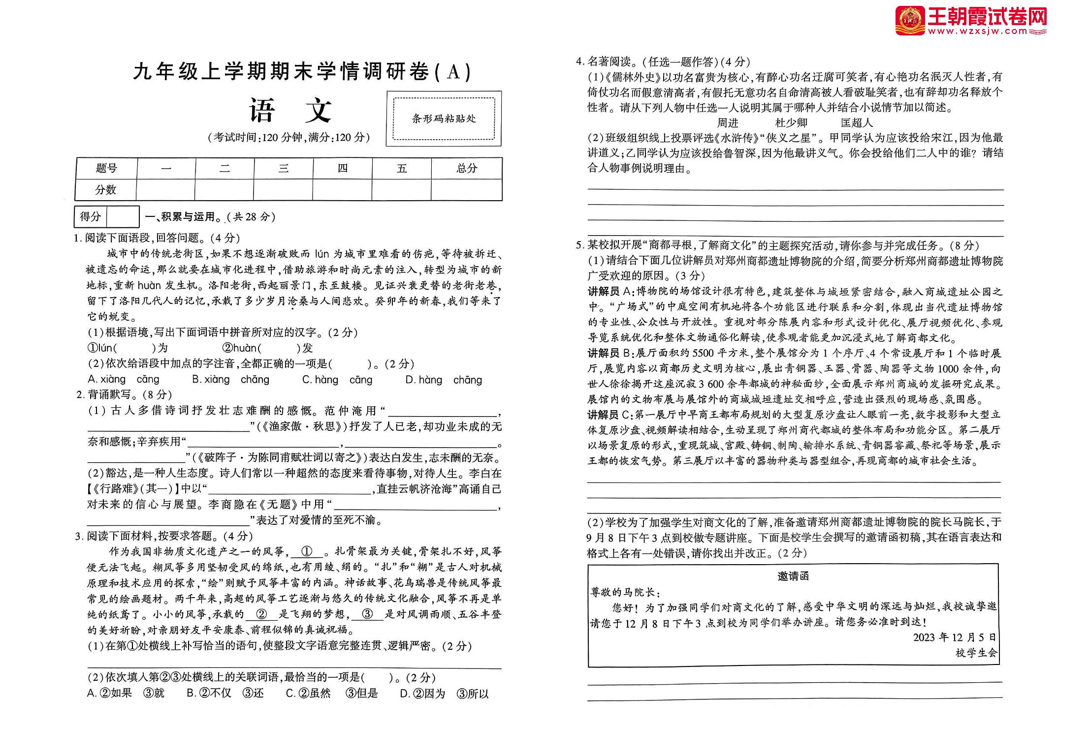 河南省安阳市龙安区2023-2024学年上学期期末学情调研卷九年级语文(人教版)