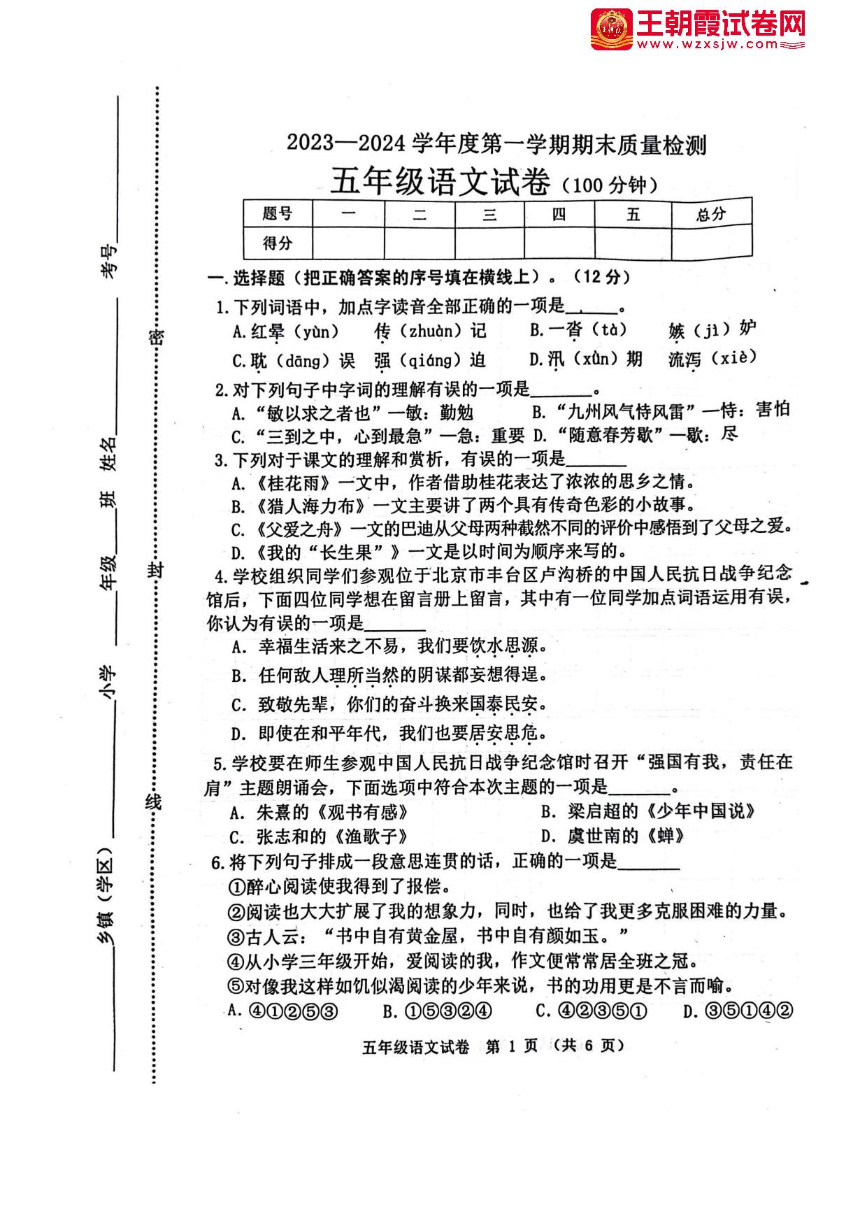 河北省秦皇岛市昌黎县2023-2024学年度第一学期期末质量检测五年级语文(人教版)