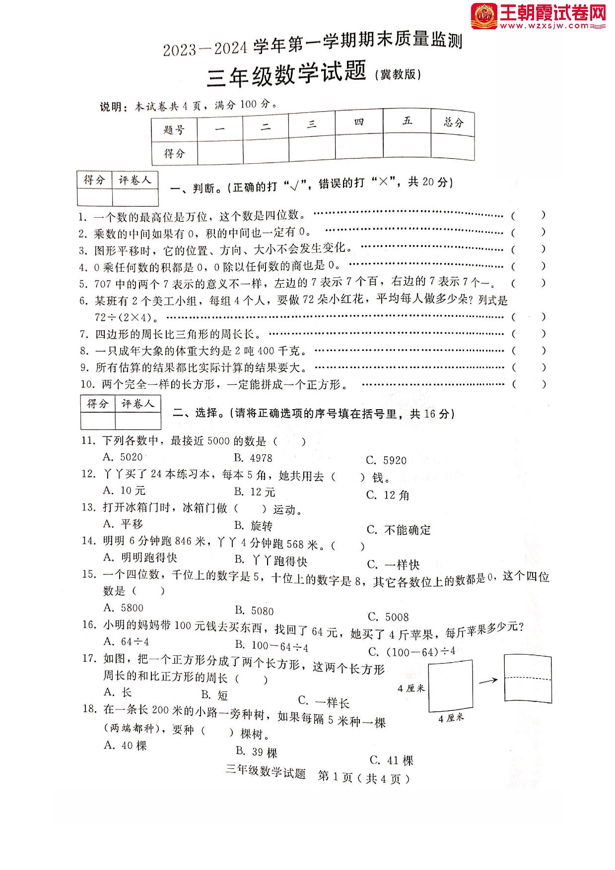 河北省邢台市任泽区2023-2024学年第一学期期末质量监测三年级数学(冀教版)