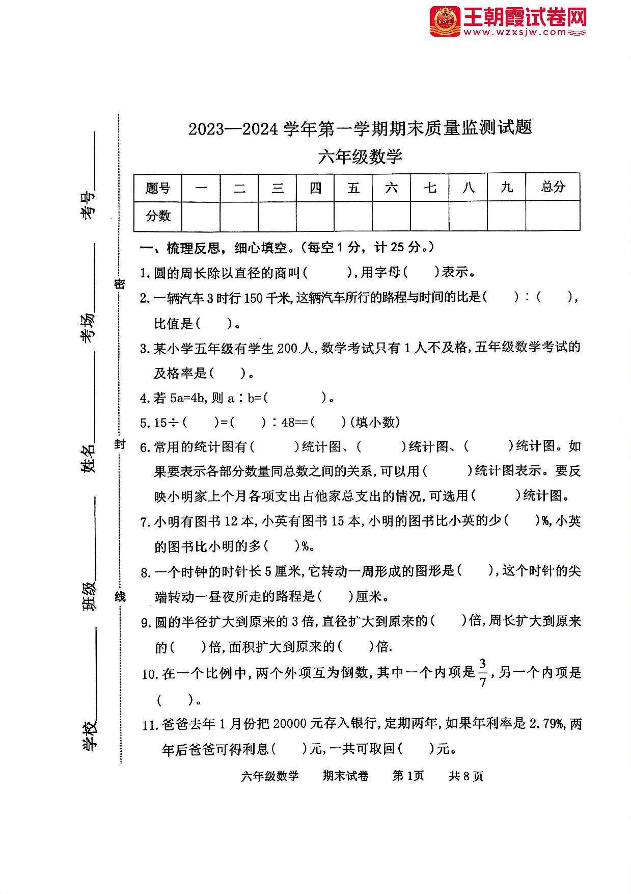 河北省承德市兴隆县2023-2024学年第一学期期末质量监测试题六年级数学(人教版)_R241109092739944